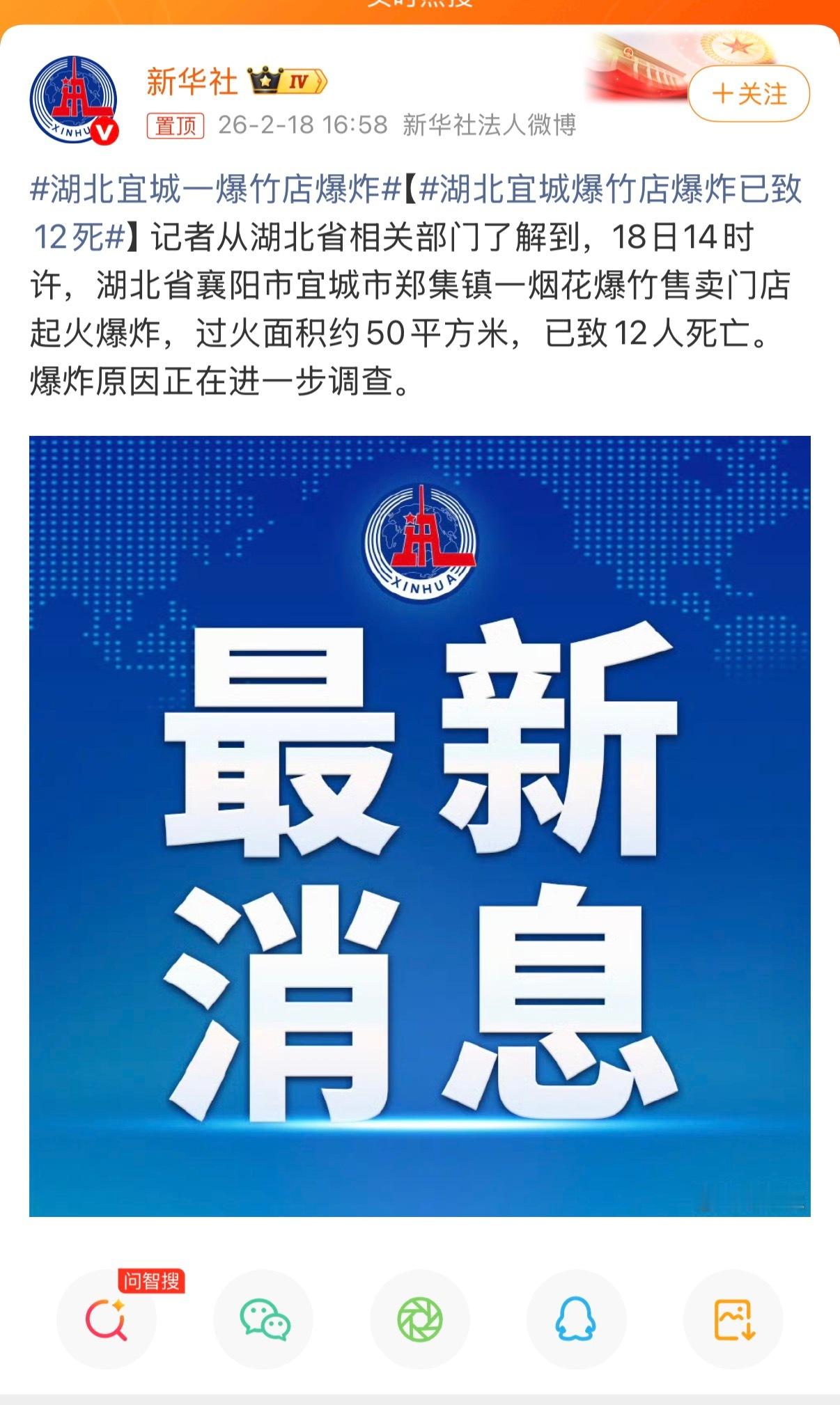 今天湖北宜城爆竹店又爆炸致12人死,愿逝者安息,相关部门彻查事故原因,全面加强烟花爆竹安全监管,避免类似悲剧重演。