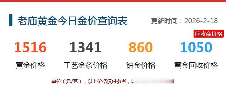 今天是2月18日, 很多金店还是处于休假状态。 老庙黄金的黄金饰品1516元, 比昨日价格回落22元; 工艺金条价格为1341元, 比昨日价格回落22元; 铂金价格为860元; 黄金的回收价格为1050元。