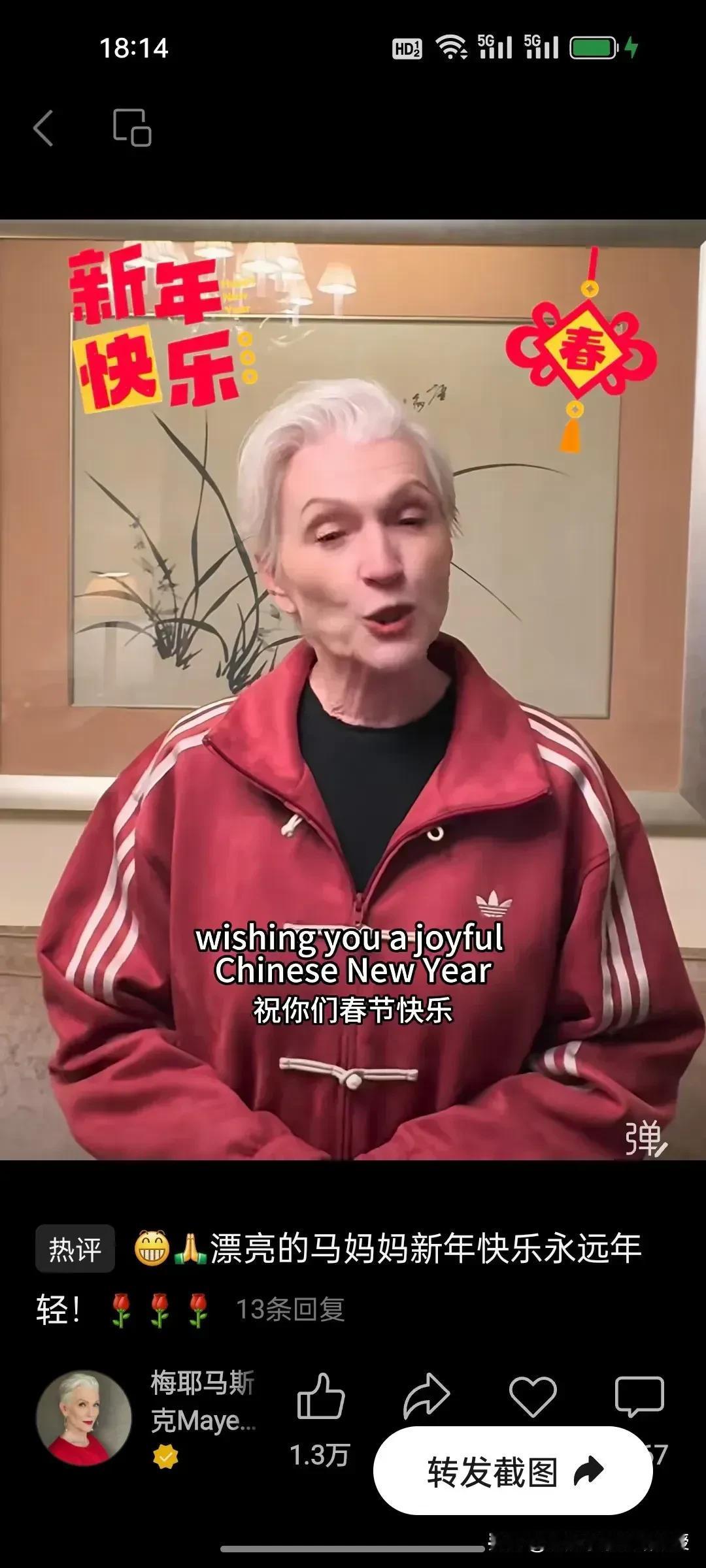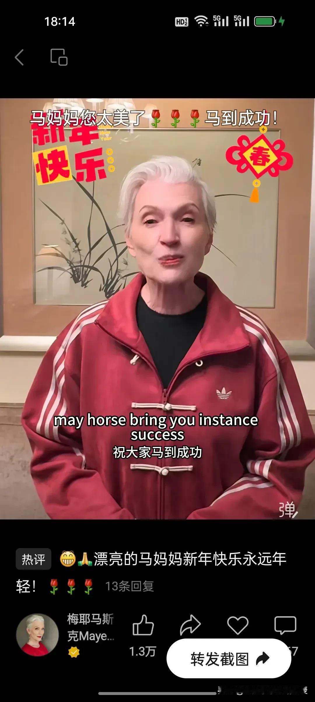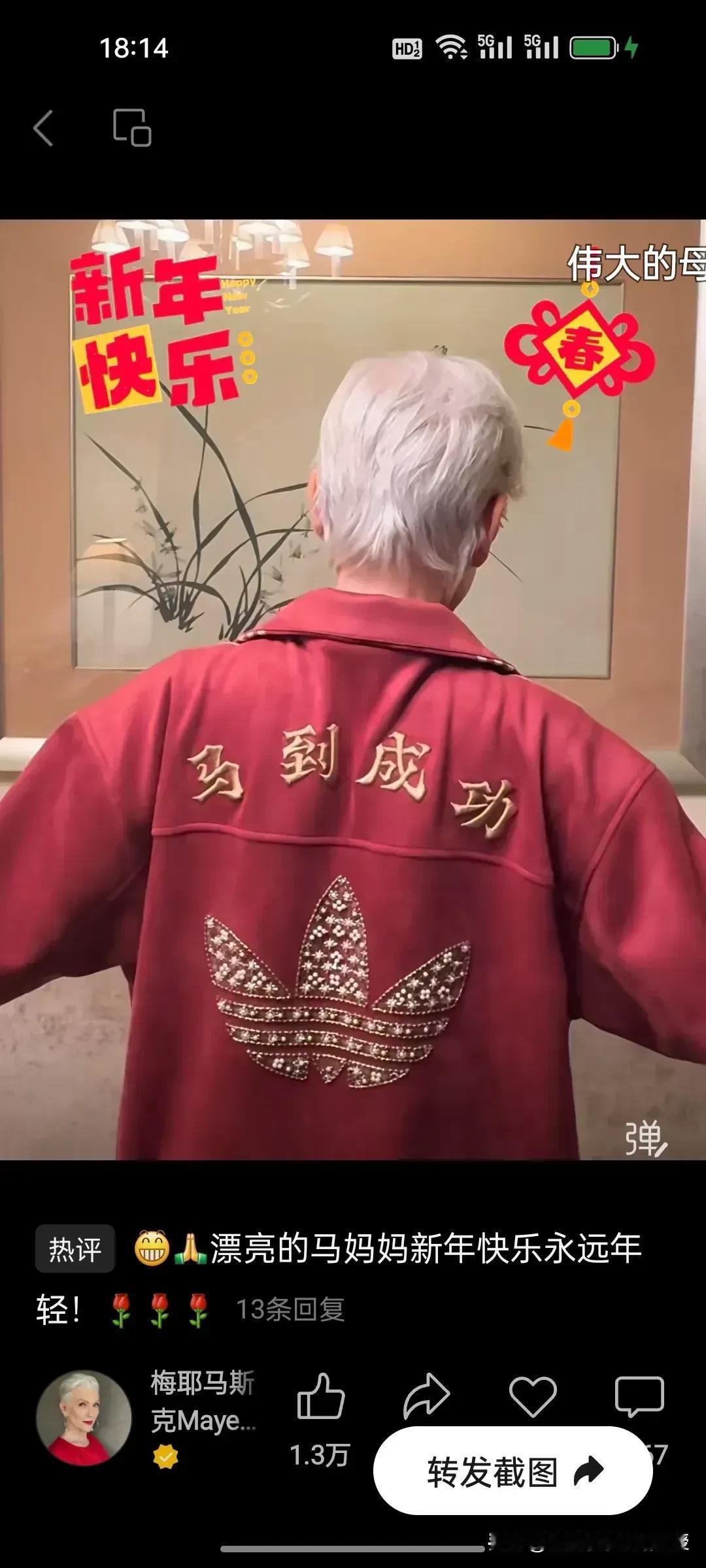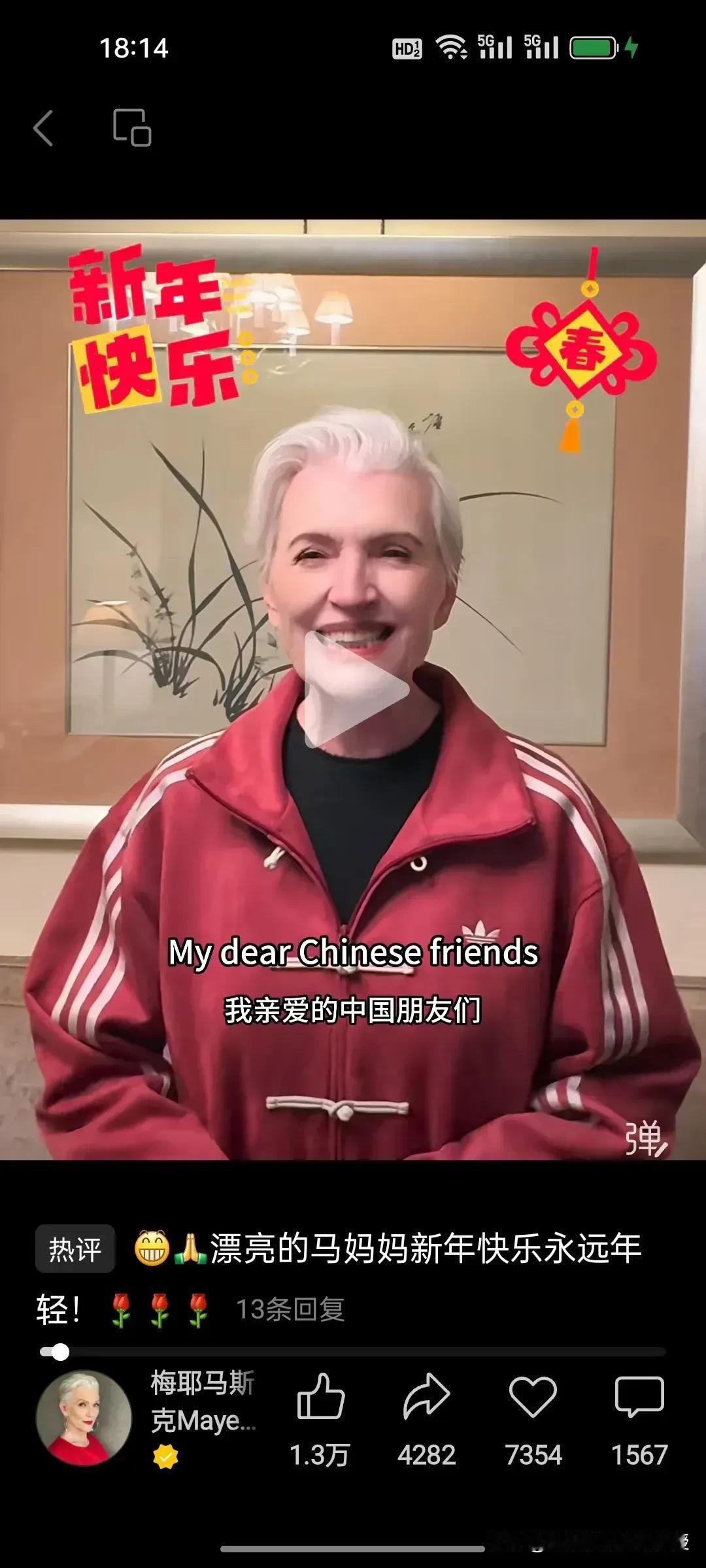 马斯克妈妈绝对是人间清醒!看下图,马斯克妈妈发了最标准版本的新年祝福。特地写了“Chinese New Year”,还发视频开头就是“亲爱的中国朋友们,祝你们春节快乐”。马斯克随后也转发了母亲的视频。 有人说,这是为了儿子的事业而讨好中国网友,未免太狭隘了。马斯克妈妈每年来好几次中国旅居,喜欢上海和杭州,回到纽约就吐槽脏乱差,你以为真的是为了赚那点代言费吗?我认为不是,她就是纯热爱中国,红色夹克上的刺绣“马到成功”,不是逢场作戏的道具,而是发自内心的喜爱。这份坦荡与真诚,才是真正的人间清醒!