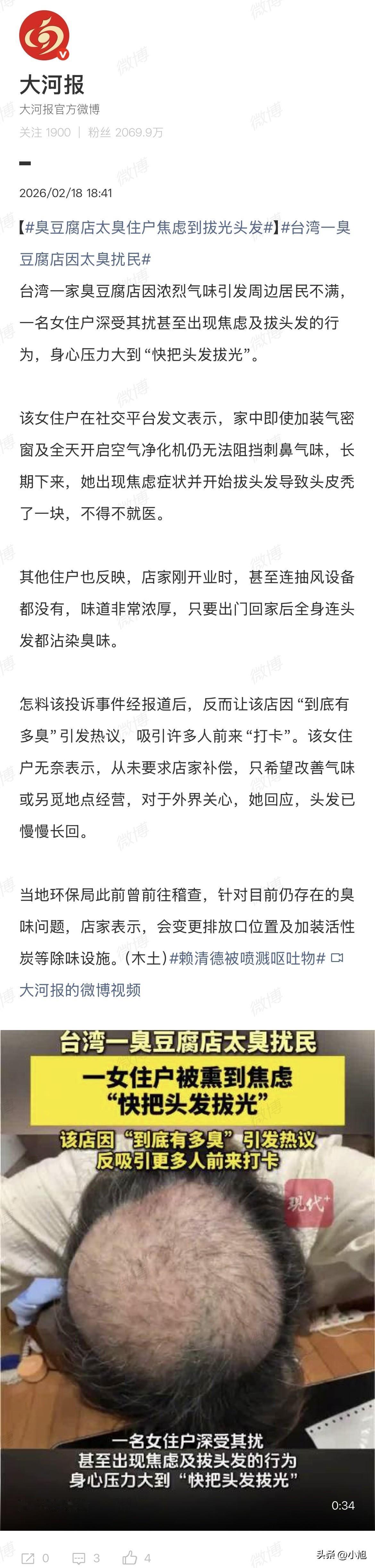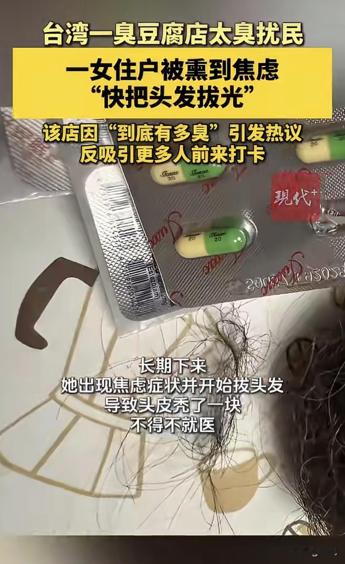真的太离谱了。 台北一位女士,被一家臭豆腐店熏到把自己头发拔光了。 这不是夸张的说法。她真的控制不住,一根一根把头发扯下来,头顶硬生生拔秃了一块,最后严重到去看心理医生,吃药控制 。 事情发生在台北中山区北安路,靠近捷运剑南路站的地方 。去年12月,花莲一家很有名的臭豆腐店在这里开了分店 。 刚开始邻居们也没多想,臭豆腐能有多大事。 等店一开起来,大家才反应过来不对劲。 那个味道不是普通臭豆腐能比的。有路过的人形容,在捷运站就能闻到一股“腐烂的屎臭味” 。有人骑车经过,还没看到店在哪儿,那股味儿就先钻进鼻子里了 。 一位女士就住在这家店附近。她在家里装了气密窗,24小时开着空气净化器,没用。 那个味道就跟长了腿一样,哪儿都能钻进去。 白天臭,晚上更臭。出门一趟回家,头发丝、衣服上全沾着那股味儿 。时间长了,她整个人都不对劲了。开始不自觉地拔头发,一根一根地拔,一撮一撮地拔。 她说,每天待在这个味道里,焦虑到极点 。 她把拔下来的头发和精神科的药袋照片发到了网上,大家这才知道事情有多严重。 更让她崩溃的是,投诉好像也没多大用。 她打过很多次电话给环保局,对方态度挺好,说会来处理,但那股味道还是天天飘进来 。她觉得环保局好像也拿这家店没什么办法 。 有自称住在店家正楼上的住户也出来说话。 说自从这家店开张,家里的窗户就再没开过。后阳台晾衣服都得关紧窗,所有门缝窗缝,得用衣服塞得死死的,才能勉强挡住一点味道 。一家人检举了无数次,都没什么变化 。 有细心的邻居发现,这家店开业前一周才把招牌挂上 。有人猜,是不是故意搞突然袭击,让周围住户来不及反应。 后来媒体来报道,事情闹大了。 结果来了个惊天大反转。 因为新闻标题太耸动,“臭到拔头发”“到底有多臭”,反而把这家店给炒火了。 一大堆好奇心爆棚的人,专门跑过去排队打卡,就想亲口尝尝,这臭豆腐到底有多大的威力,能把人臭到去看心理医生 。 队越排越长,生意反而更好了。 那位拔头发的女士看着这一切,心里什么滋味,外人真的很难想象。 她从始至终没要过一分钱赔偿,只希望店家能改善一下味道,或者搬去一个人少点的地方 。 但现实是,她的痛苦,成了别人打卡的景点。 后来环保局出来说话了,大家才知道背后的数字有多惊人。 环保局说,这家店从开业就不断接到投诉 。去年2月,他们派人去做了专业的“异味污染物官能测定”,就是用仪器和人的鼻子一起判断到底有多臭 。检测结果出来,数值是71 。 而那个区域的排放标准,是10。 超标7倍 。 环保局依法开罚,58.5万新台币,大概13万人民币 。店家被罚后加装了一些处理设备,后来复查达标了 。 但今年年初,还是有住户反映有味道。环保局1月29号又去查,在住户家周围确实还能闻到一点 。店家这次又承诺,会改排放口的位置,再加装活性炭除味设备,说年后就能弄好 。 那位女士后来也回应了,说谢谢大家关心,她的头发已经慢慢长回来了 。 但那股味道,到底还会不会飘进她家,还是个未知数。 有人说,这不就是个味道的事吗,至于吗? 但事情没那么简单。 有人喜欢臭豆腐,觉得那叫一个香。但对每天24小时泡在这个味道里的人来说,这叫折磨。 更何况,这个味道已经重到让一个人精神出问题,重到需要吃药控制,重到让人把自己头发拔光。 公视新闻在报道这件事时,还提了一个挺有意思的细节。说台北之前也有类似的投诉,但不是因为臭。有一家很有名的甜甜圈店,因为做甜甜圈的香味太浓,被邻居投诉到受不了,最后被罚了10万 。还有一家六十年的中药行,熬枇杷膏的味道太香,也被邻居检举,罚了10万 。 香过头,臭过头,其实都一样。 你喜欢的东西,对别人来说可能就是灾难。 这家臭豆腐店现在还在那儿开着,队还在排,味道不知道什么时候才能真正解决。 那位女士的头发长回来了,但谁知道那股味道,会不会让她再次伸出手,扯下自己的头发? 所以你们说,这种味道特别大的店,到底该不该开在住宅区?如果是你邻居,你能忍多久?
