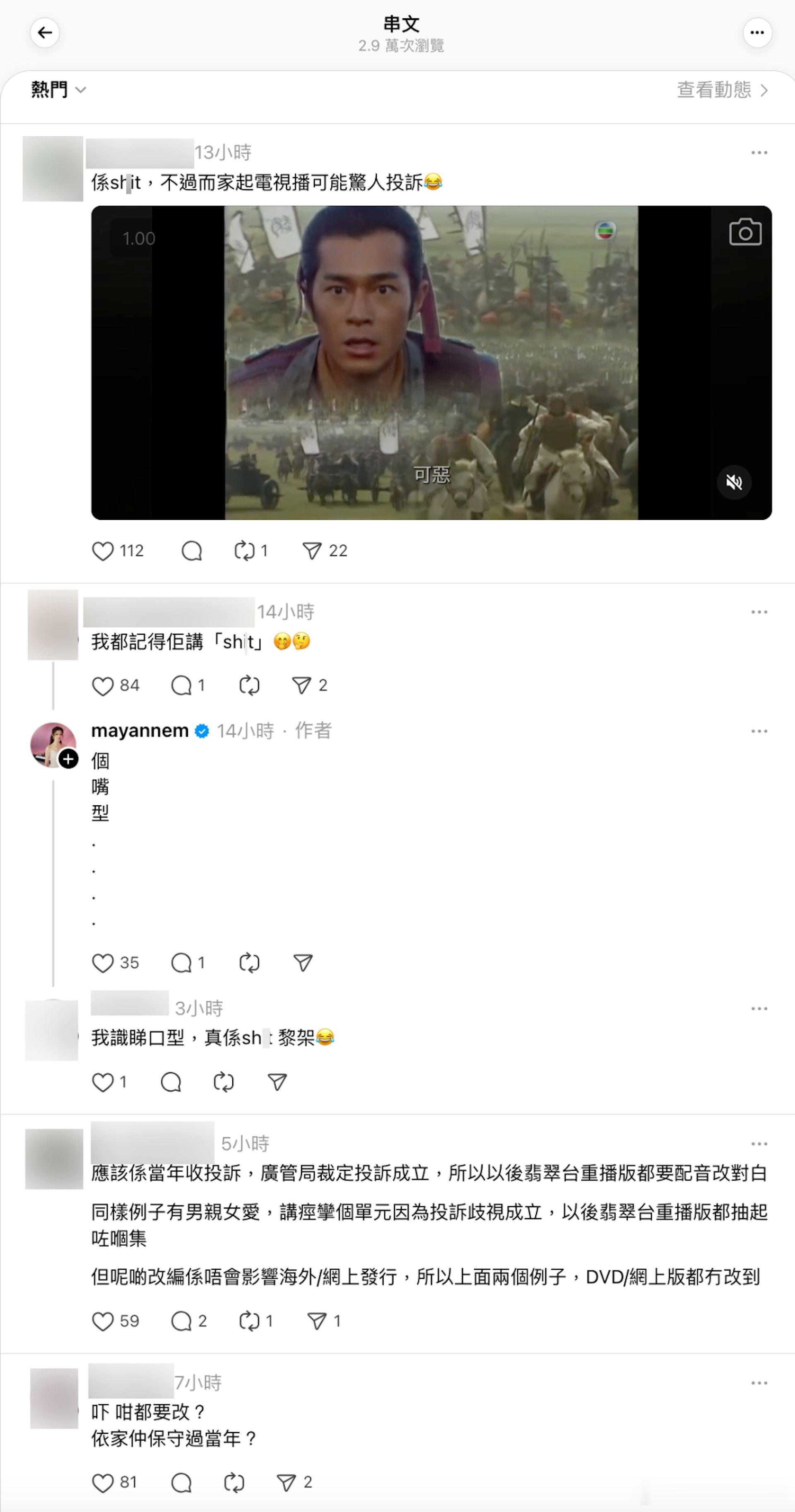 事件引起熱議,有網民附和指自己都記得當年是講「Shxt」,有人更貼出另一段片段,項少龍的確是講「Shxt」,而口型亦吻合,網民就推斷可能因為「Shxt」是不雅用語有關:「應該係當年收投訴,廣管局裁定投訴成立,所以以後翡翠台重播版都要配音改對白,同樣例子有《男親女愛》,講痙攣個單元因為投訴歧視成立,以後翡翠台重播版都抽起咗嗰集」。不過亦有人指,當年首播的確是講「吓」,是後來推出的發行版錄影帶才變成「Shxt。」TVB