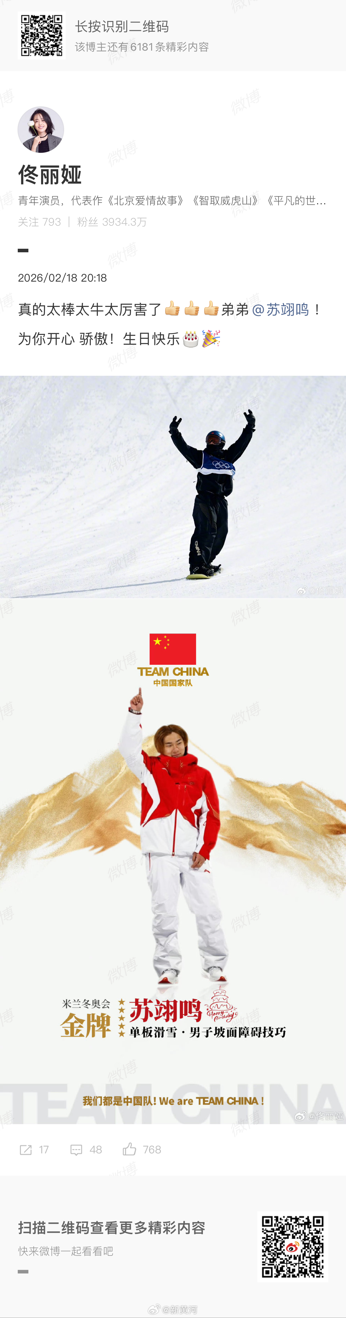 【#佟丽娅祝贺苏翊鸣夺金# 】米兰冬奥会单板滑雪男子坡面障碍技巧决赛,中国选手苏翊鸣夺得金牌。随后演员发文祝贺:真的太棒太牛太厉害了弟弟!为你开心 骄傲!生日快乐🎂🎉 #苏翊鸣金牌# #苏翊鸣单板滑雪坡障技巧决赛#