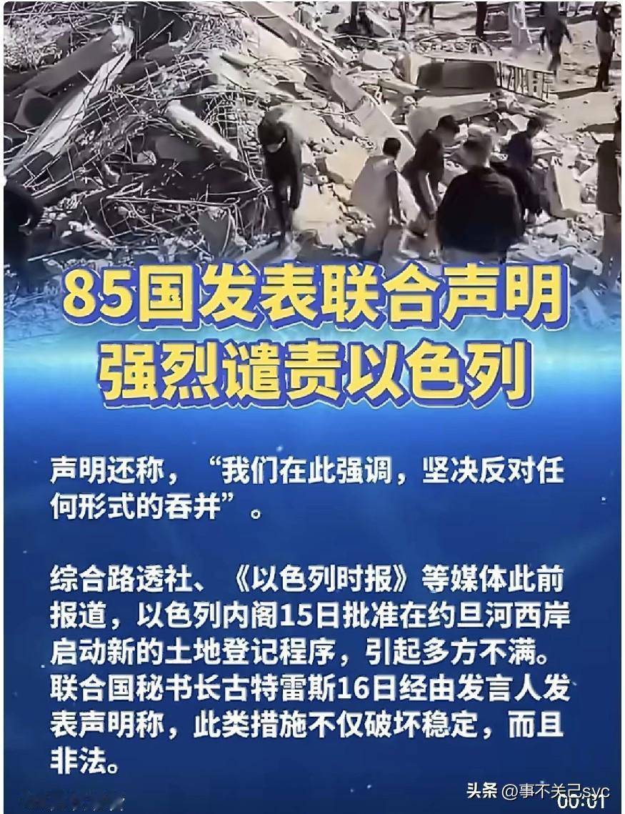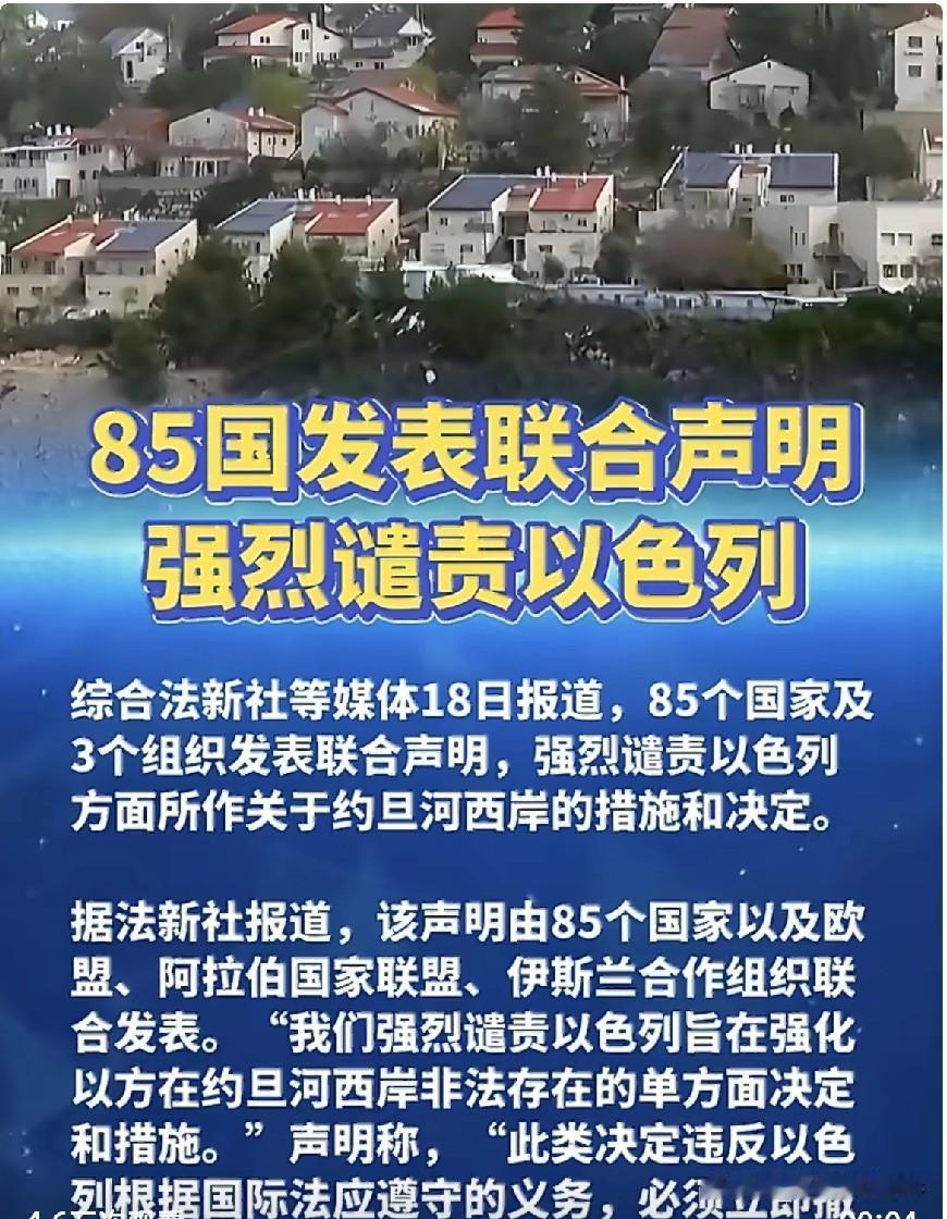 根据多家外媒2月18日报道,85个国家在联合国联合发表声明,强烈谴责以色列旨在扩大其在约旦河西岸“非法存在”的单边措施 。 此次事件的导火是,以色列内阁2月15日批准的土地登记新程序,该程序旨在将约旦河西岸大片土地登记为“国有土地” 。 85国声明,直指相关决定违反国际法,必须立即撤销,并强调坚决反对任何形式的吞并 。 除了85个成员国(包括沙特、中国、俄罗斯、法国、德国等),欧盟、阿拉伯国家联盟、伊斯兰合作组织也加入了此次联合声明 。 声明称,“此类决定违反以色列根据国际法应遵守的义务,必须立即撤销。”坚称,“我们在此强调,坚决反对任何形式的吞并”。 联合国秘书长古特雷斯已发声,呼吁以色列立即撤销此类“破坏稳定且非法”的措施 。 此次事件是近期巴以局势紧张的最新升级。除了约旦河西岸,加沙地带的情况也备受关注。 内塔尼亚胡访美回来,就开始了对约旦河西岸的占领,看来可能是得到了某些授权或默许。内塔尼亚胡对在约旦河西岸建立定居点预谋已久,今次终于出手了。面对国际社会的齐声反对,内塔尼亚胡有可能置之不理,一意孤行。只要美国不明确表示反对,内塔尼亚胡是不会住手的。