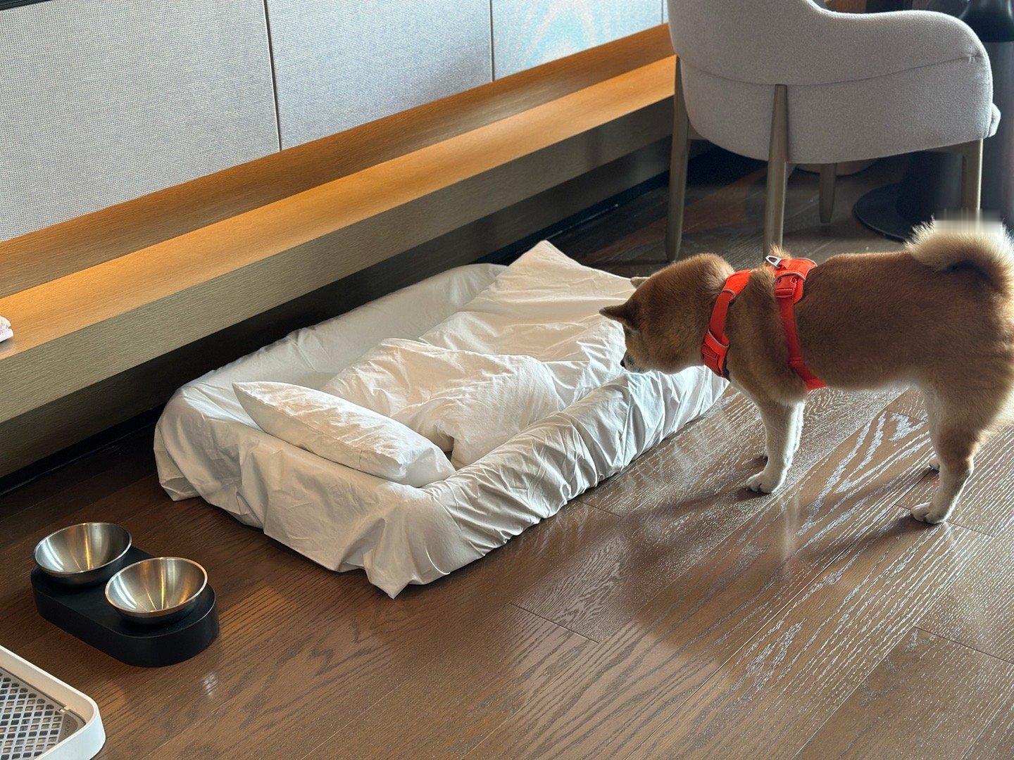 在滴水湖畔找了一家宠物友好的酒店,加一张狗床500元。寿司姐进屋后对新床奋力嗅闻,体现出了强烈的好奇心与不信任感,目测今晚仍将安稳睡在我们带来的自家狗窝里。