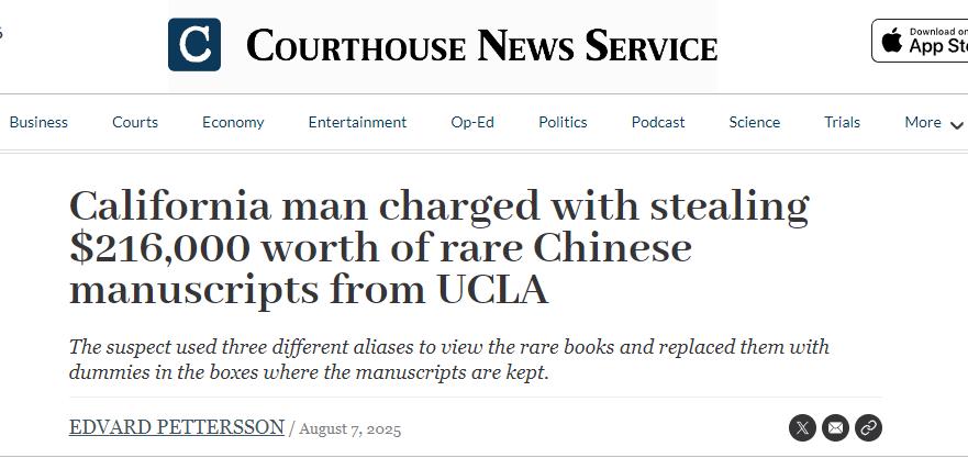 谁能想到,一场持续大半年的“古籍回家”计划,竟被一个38岁华裔男子悄无声息完成,手段之高,连美国FBI和加州大学图书馆管理员,都被蒙在鼓里,直到事发才后知后觉。   这个男子名叫杰弗里·应,是美国华裔,看着平平无奇,骨子里却藏着一股韧劲。他没搞轰轰烈烈的举动,就靠一招“偷梁换柱”,把本该属于中国的珍贵文献,悄悄从美国运了回来。   事情要从2024年12月说起,杰弗里·应开始频繁出现在加州大学洛杉矶分校(UCLA)图书馆,不过他没敢用自己的真名,而是换了好几个化名,装作普通的研究者,专门借阅中国古籍文献。   UCLA图书馆里藏着不少宝贝,尤其是中国古代文献,大多有几百年历史,有的还是孤本,价值连城,这些文献,不少是早年流失海外的,一直没能回到咱们国家的怀抱。   杰弗里·应心里跟明镜似的,直接硬抢肯定不行,借阅之后不还,很快就会被发现,思来想去,他想到了一个绝妙的法子——复刻赝品,用假的换真的,神不知鬼不觉。   为了把赝品做得天衣无缝,他专门花时间钻研复刻技术,从纸张的材质、颜色,到字迹的笔法、墨色,甚至文献上的磨损痕迹,都一一模仿,力求做到一比一还原,半点不马虎。   没人知道他在背后付出了多少努力,只知道从2024年底到2025年7月这大半年里,他多次以借阅为名,从图书馆借出中国珍贵文献,看完之后,就把自己复刻的赝品还回去,真品则悄悄藏起来。   图书馆管理员压根没多想,毕竟每天借阅的人不少,谁也不会特意去核对每一本归还的书籍,再加上杰弗里·应的赝品做得太过逼真,连细微的磨损都模仿到位,压根看不出破绽。   就这样,一次次借阅,一次次替换,杰弗里·应悄无声息地攒下了不少中国珍贵文献,根据美国司法部后来的调查,他盗窃的这些文献,总价值高达21.6万美元,换成人民币差不多150多万。   拿到真品之后,杰弗里·应没有久留,他利用自己往返中美两国的便利,一次次把这些珍贵文献偷偷运回中国,每一次都小心翼翼,避开所有检查,生怕出一点差错,毁了整个计划。   纸终究包不住火,2025年8月,UCLA图书馆在整理古籍文献时,偶然发现一本归还的中国文献不对劲,纸张手感、字迹细节都有问题,仔细核对后,才发现竟是赝品。   这一发现可把图书馆吓坏了,赶紧全面排查,这一查才发现,不止一本文献被替换,前前后后有不少珍贵古籍都被掉了包,图书馆立刻报警,美国联邦调查局(FBI)很快介入调查。   FBI顺着借阅记录一步步追查,排除了所有可疑人员,最后把目光锁定在了杰弗里·应身上,调取他的借阅记录、旅行记录后,所有证据都指向了他,真相彻底浮出水面。   很快,杰弗里·应被美国司法部指控“盗窃重要艺术品”重罪,面临严厉的刑事处罚。消息一出,立刻在中美两国引起热议,有人佩服他的勇气,也有人觉得他的做法不妥。   很多人疑惑,杰弗里·应身为美国华裔,为啥要冒着这么大的风险,偷运中国古籍回国?其实了解内情的人都知道,这些流失海外的中国古籍,承载着咱们中华民族的文化根脉。   早年因为各种原因,不少中国珍贵文物、古籍文献流失海外,有的被博物馆收藏,有的被私人珍藏,还有的甚至遭到破坏,想要让它们回家,难度极大,每一步都充满阻碍。   杰弗里·应的做法,虽然违背了美国的法律,却藏着对中华传统文化的敬畏和眷恋,他或许没有更好的办法,只能用这种极端的方式,让这些漂泊已久的古籍,重新回到祖国的怀抱。   有人说他是小偷,违背法律就该受到惩罚;也有人说他是英雄,默默守护中华文脉,冒着风险让古籍回家,两种声音争论不休,却都忽略了一个核心——这些古籍,本就属于中国。   咱们不提倡用违法的方式追回流失文物,但也无法否认,杰弗里·应的举动,背后是对民族文化的热爱,每一件流失海外的文物、每一本古籍,都是咱们民族的记忆,都值得被守护。   如今,越来越多的人开始关注流失海外的中国文物,咱们国家也在通过合法途径,一步步追回属于我们的文化瑰宝,古籍回家,文物归乡,从来都不是一个人的战斗,而是整个民族的心愿。   文化根脉不能丢,漂泊的瑰宝终要归乡,杰弗里·应的做法或许有争议,但他让更多人关注到了流失海外的中国古籍,也让我们明白,守护中华传统文化,从来都刻不容缓。
