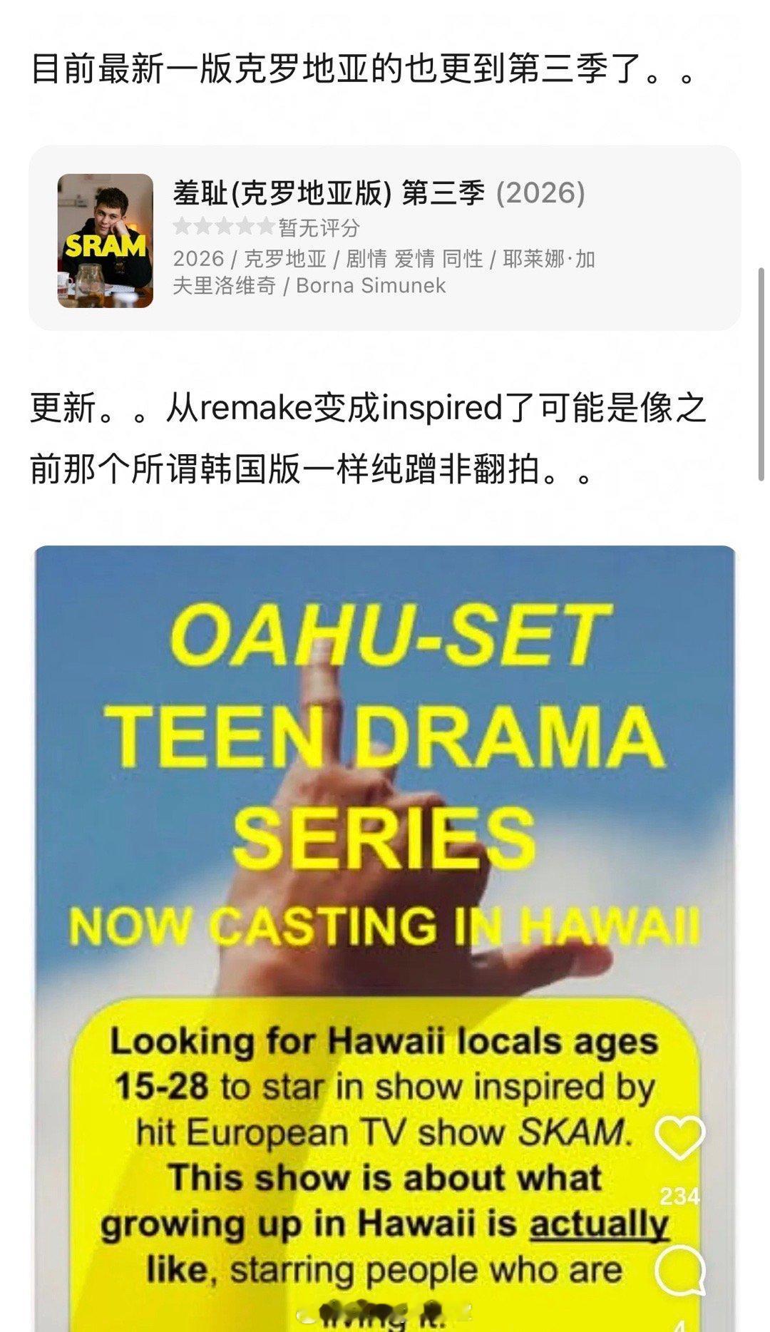 Skam真的要被翻拍一辈子,夏威夷版本的开始招演员了,这都第几个版本啦