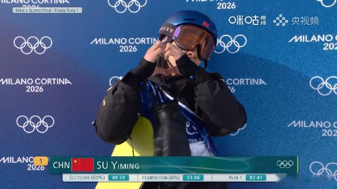 苏翊鸣首轮排第一 单板滑雪男子坡面技巧决赛首轮争夺结束,中国选手苏翊鸣得分82.