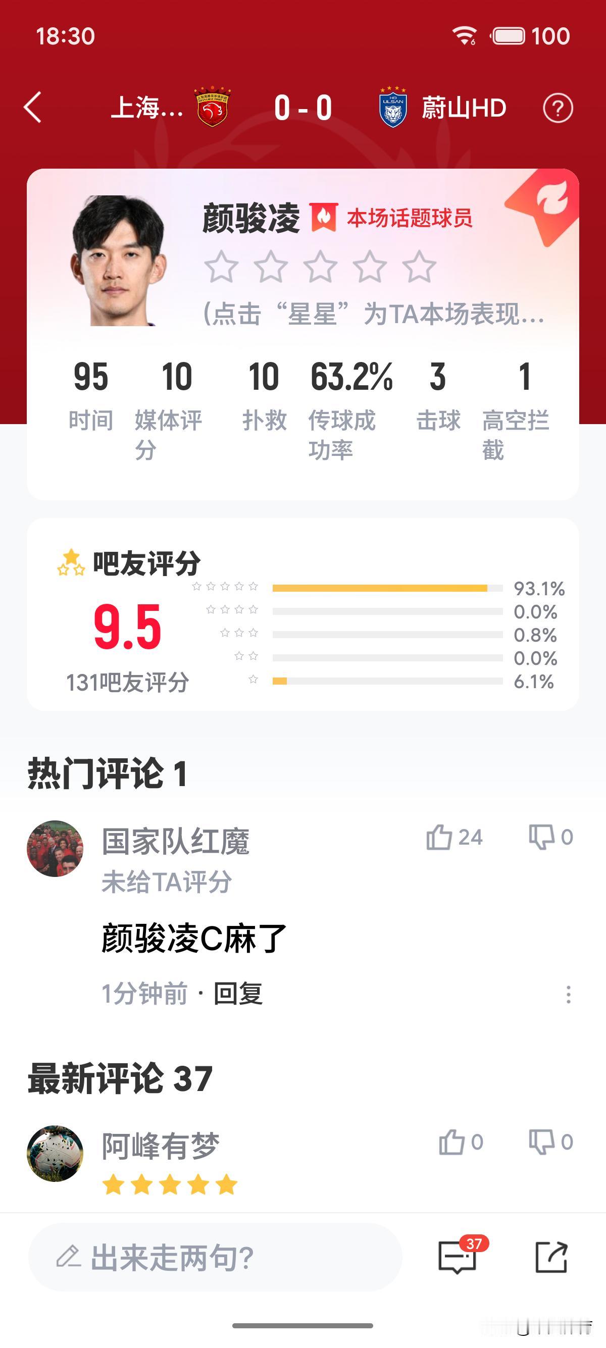在今晚的亚冠精英联赛中,上海海港与蔚山HD战成0:0平! 有句说句,上海海港本场能逼平对手,球队队长,门将颜骏凌是是最大的功臣,没有之一! 本场亚冠联赛,颜骏凌带上了队长袖标首发出场九十分钟,全场贡献了10次扑救!同时,他还有62%.的传球成功率!有3次拳击球!还有一次高空拦截!用出色的发挥力保上海海港城门不失! 在赛后的评分中,媒体给出了十分的满分!球迷也给出了9.5分的高分!不可质疑的海港最佳球员!