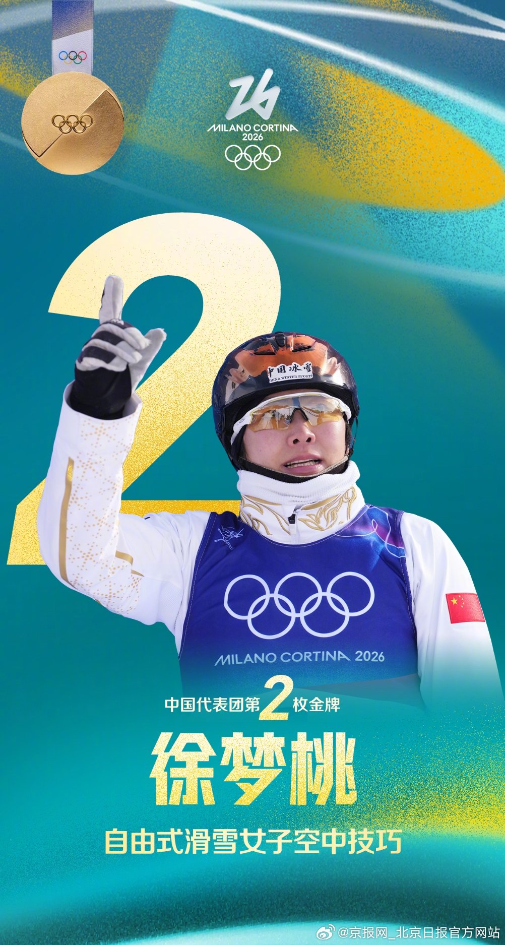 【海报|#中国代表团收获第二金#,徐梦桃卫冕成功】#邵琪获铜牌# 北京时间2月18日晚,在2026年米兰冬奥会自由式滑雪女子空中技巧决赛中,北京冬奥会该项目冠军、中国名将徐梦桃成功卫冕,为中国代表团再添一枚金牌。另外两位进入决赛最终轮的中国选手,邵琪收获铜牌,孔凡钰收获第四名。中国队,好样的! 记者 李婷婷