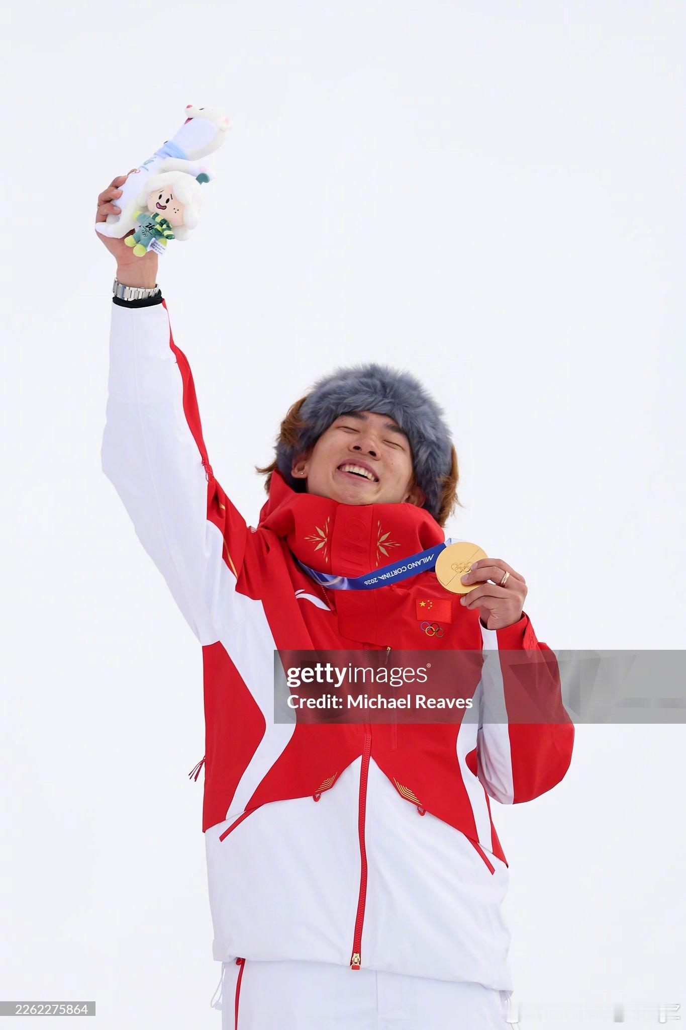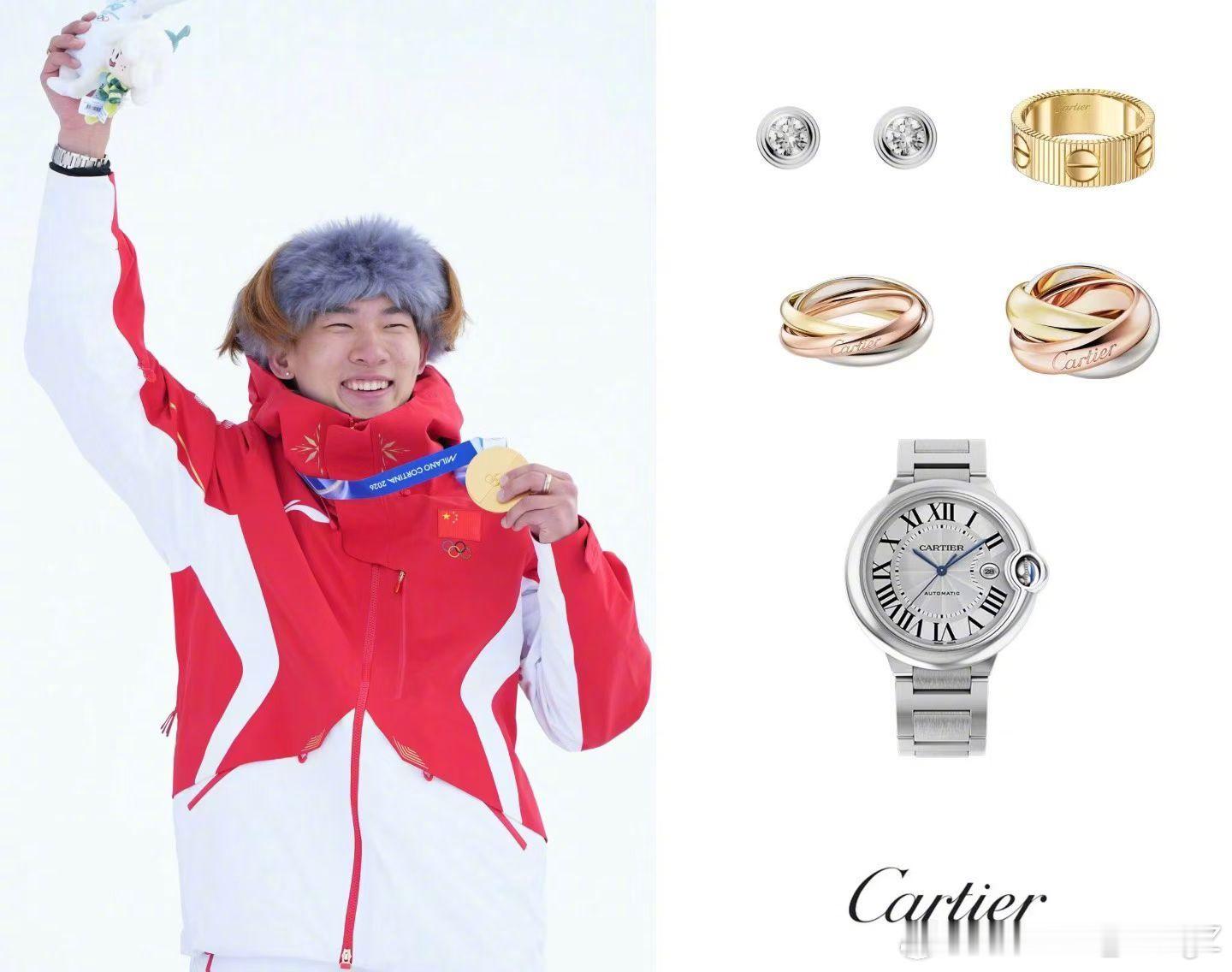 苏翊鸣真是超敬业的品牌大使,最高领奖台上同样醒目的还有 Cartier 珠宝和腕表苏翊鸣金牌