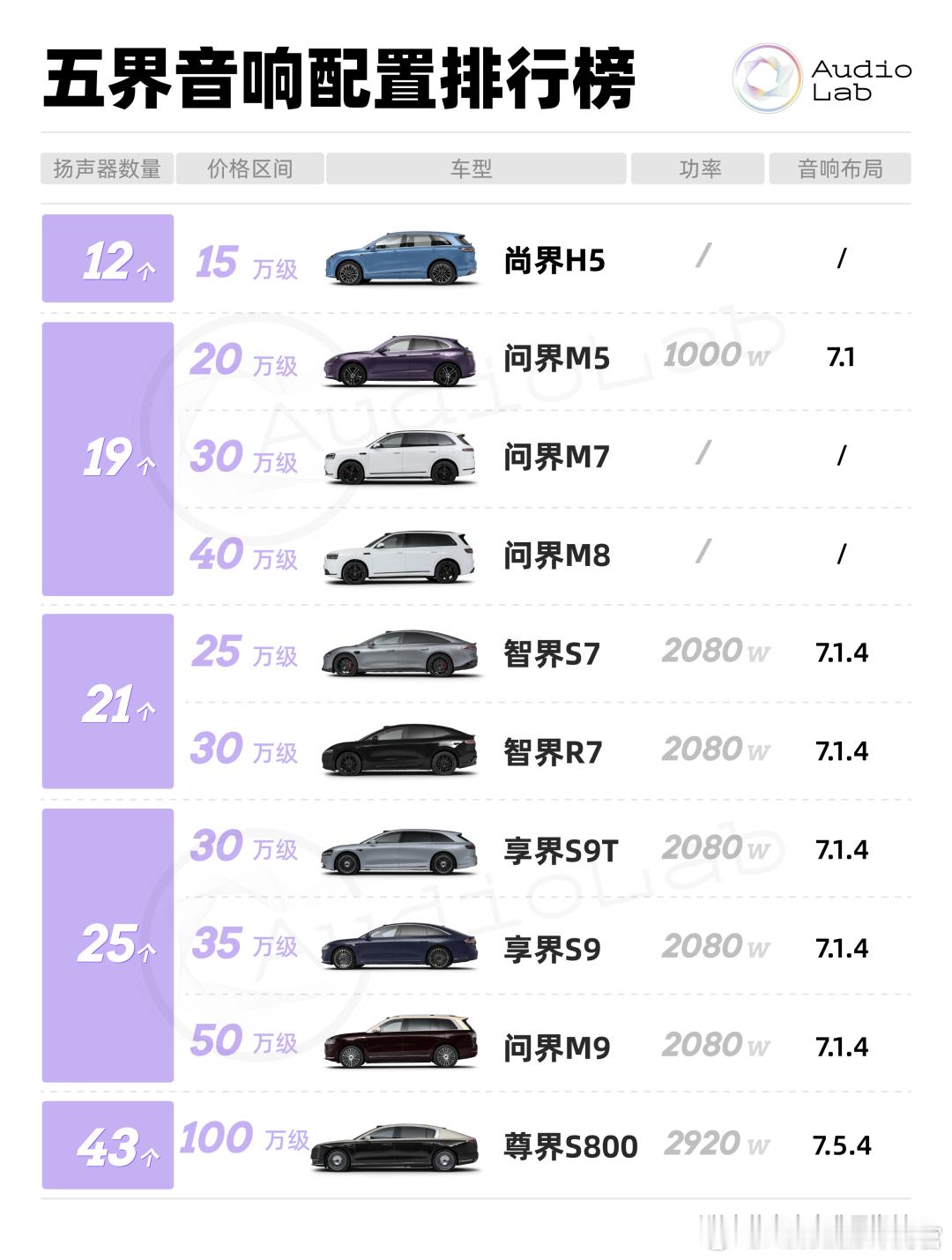 扬声器数量、功率、以及声道布局等规格,基本按照品牌矩阵中不同的价位以及车型定位进行梯度划分。