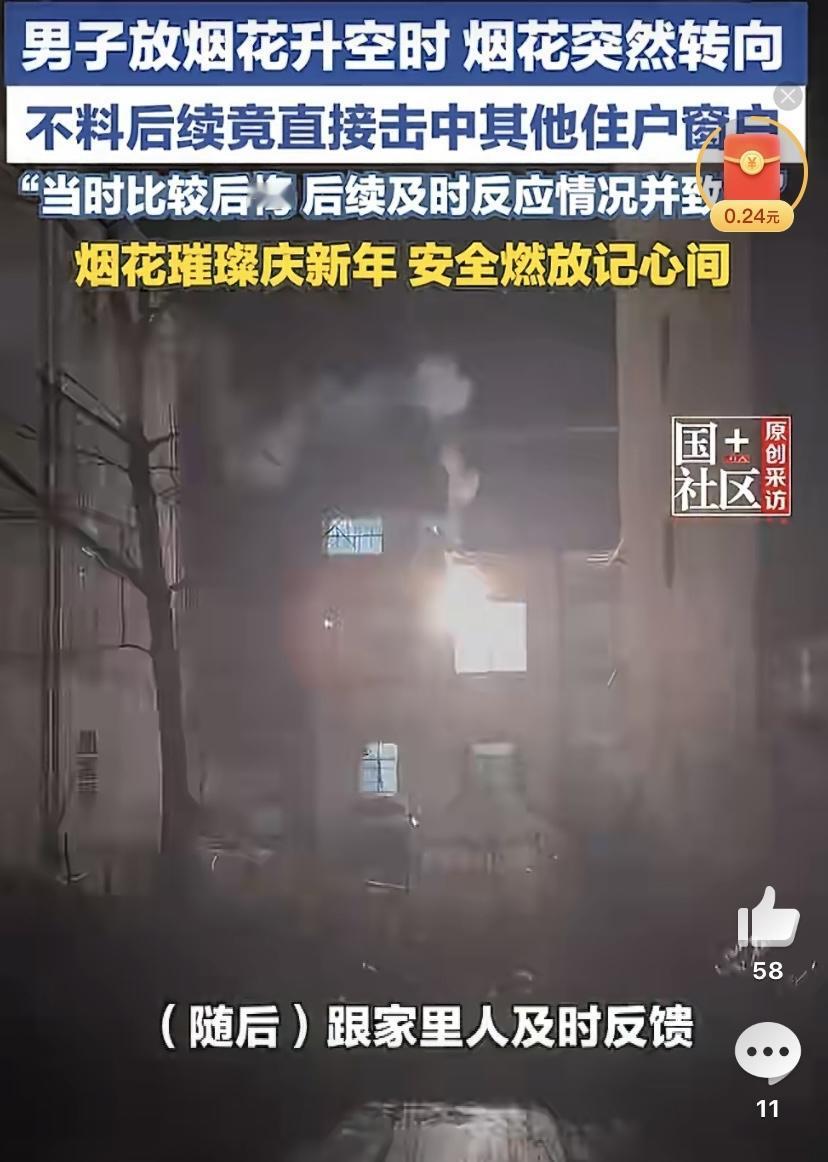 最近有段视频看得人心里一紧,一名男子在户外放烟花,本想拍个好看的升空画面留个纪念,没想到烟花刚飞起来就突然变向,直直冲着居民楼的窗户撞过去,玻璃当场被砸坏,墙面也留下痕迹。好在当时屋里没人,没有造成人员受伤,男子事后也主动道歉、承担责任,算是不幸中的万幸。可这事光看画面就够吓人,换作屋里有人,后果真的不敢想。 大家过年爱放烟花,图的就是热闹和年味,觉得喜庆又解压,可很多人都忽略了,烟花看着漂亮,其实藏着不小的危险。这次烟花突然转向,可能是摆放不稳、地面不平,也可能是产品本身有小问题,再加上燃放时没选好位置、离楼太近,一点小疏忽就变成大意外。平时总觉得事故离自己很远,真轮到头上,后悔都来不及。 每年假期,因为放烟花出的事真不少,有的炸伤手和脸,有的引燃窗帘、阳台杂物引发火灾,还有的像这次一样砸坏别人家窗户、车子。这些事不是吓唬人,都是真实发生在我们身边的教训。图一时开心,拿自己和别人的安全冒险,实在太不值。欢乐的前提永远是安全,不管是自己放,还是带着孩子玩,都不能抱着侥幸心理。 选空旷、远离楼房和易燃物的地方,放之前把烟花摆稳放平,点完赶紧退到安全距离,不近距离拍摄、不凑上去看,这些简单的步骤,真的能挡住很多危险。别等意外发生才明白,平安过年,比什么都重要。热闹要有,规矩更要守,对自己负责,也是对身边每一个人负责。 你身边有没有遇到过烟花燃放的惊险事?平时放烟花都会注意哪些安全细节?欢迎在评论区聊聊,也把安全提醒转给家人朋友,让大家都能平平安安过年。男子放烟花升空时突然转向击中窗户 来源:纵览新闻