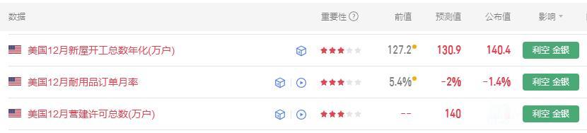 今晚有多项美国经济数据公布。 首先美国12月新屋开工总数年化 140.4万户, 市场预期130.9万户。 其次美国12月耐用品订单月率 -1.4%, 市场预期-2%,前值由5.30%修正为5.4%。 最后美国12月营建许可总数 144.8万户, 为2025年3月以来新高;市场预期140万户。 还有美国纽约联储商业活动指数报-25.7,创五年新低。 这几项数据都是利空金价的, 数据公布以后,金价冲高减弱。