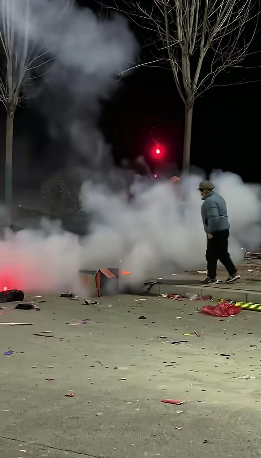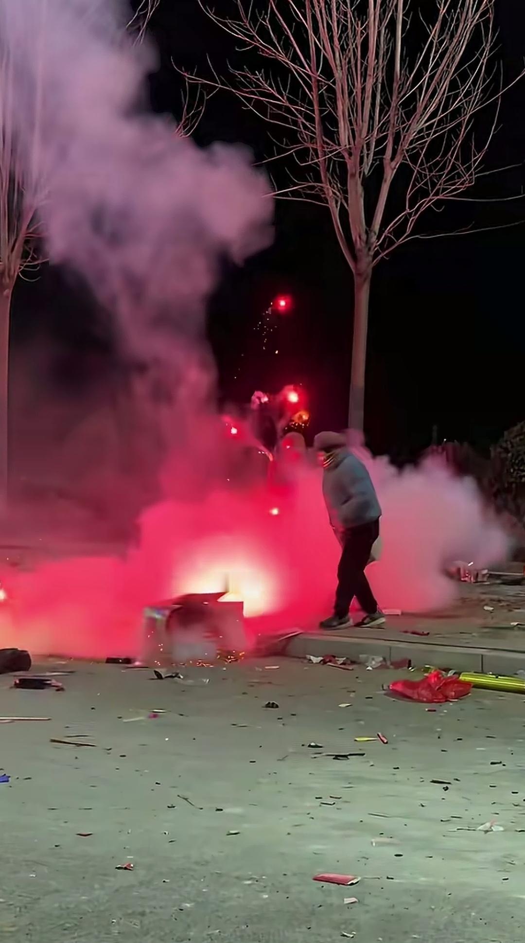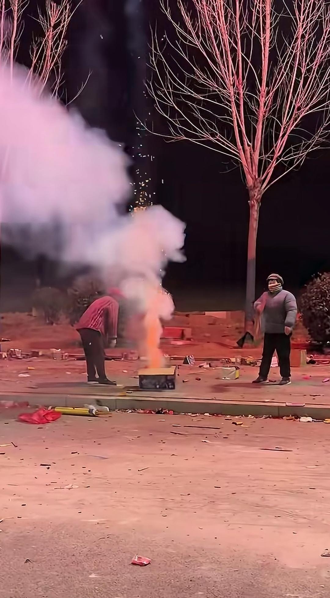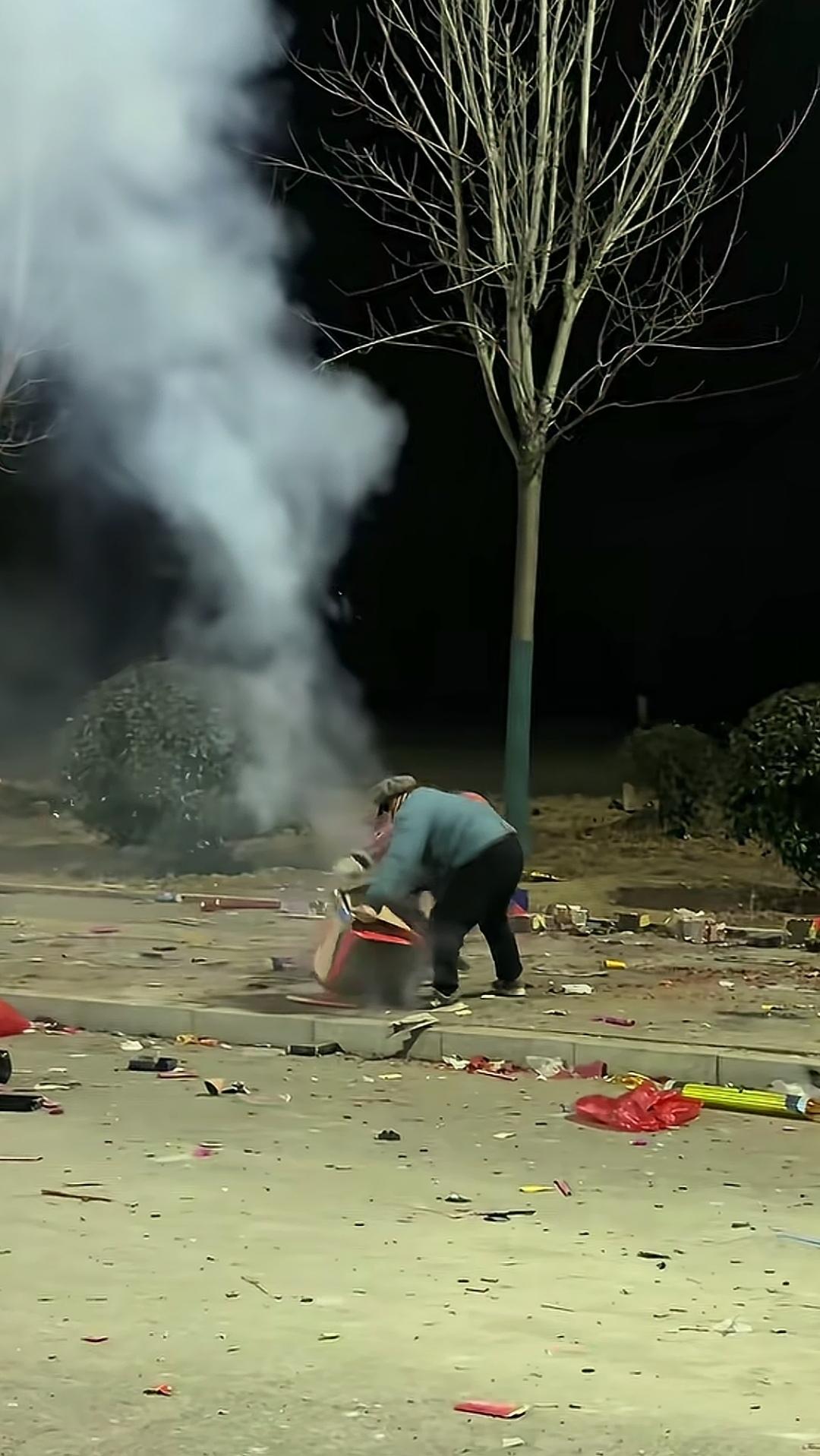 为了将眼前仍在燃放的烟花炮筒据为己有,画面中的两位大妈都想抢先一步拿到手。 在明知存在危险的情况下,她们竟相互拉扯着座盘,致使烟花爆筒倒地、火星乱溅,自己也置身于危险之中。 为了价值几毛钱的炮筒壳子,要是被倒地的烟花射中,那可真是得不偿失! 烟花乱扔
