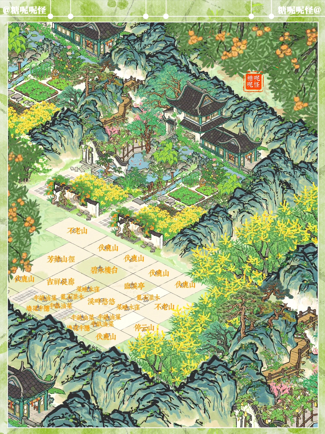 夏限碧水楼梯和吉祥长廊完美衔接 建筑:碧水楼台|临溪亭|溪畔悠悠|菜畦水洼|伏鹿山|不老山|停云山|吉祥长廊|墙花半隐|半亩油菜|清夏木栾|乱石灌木