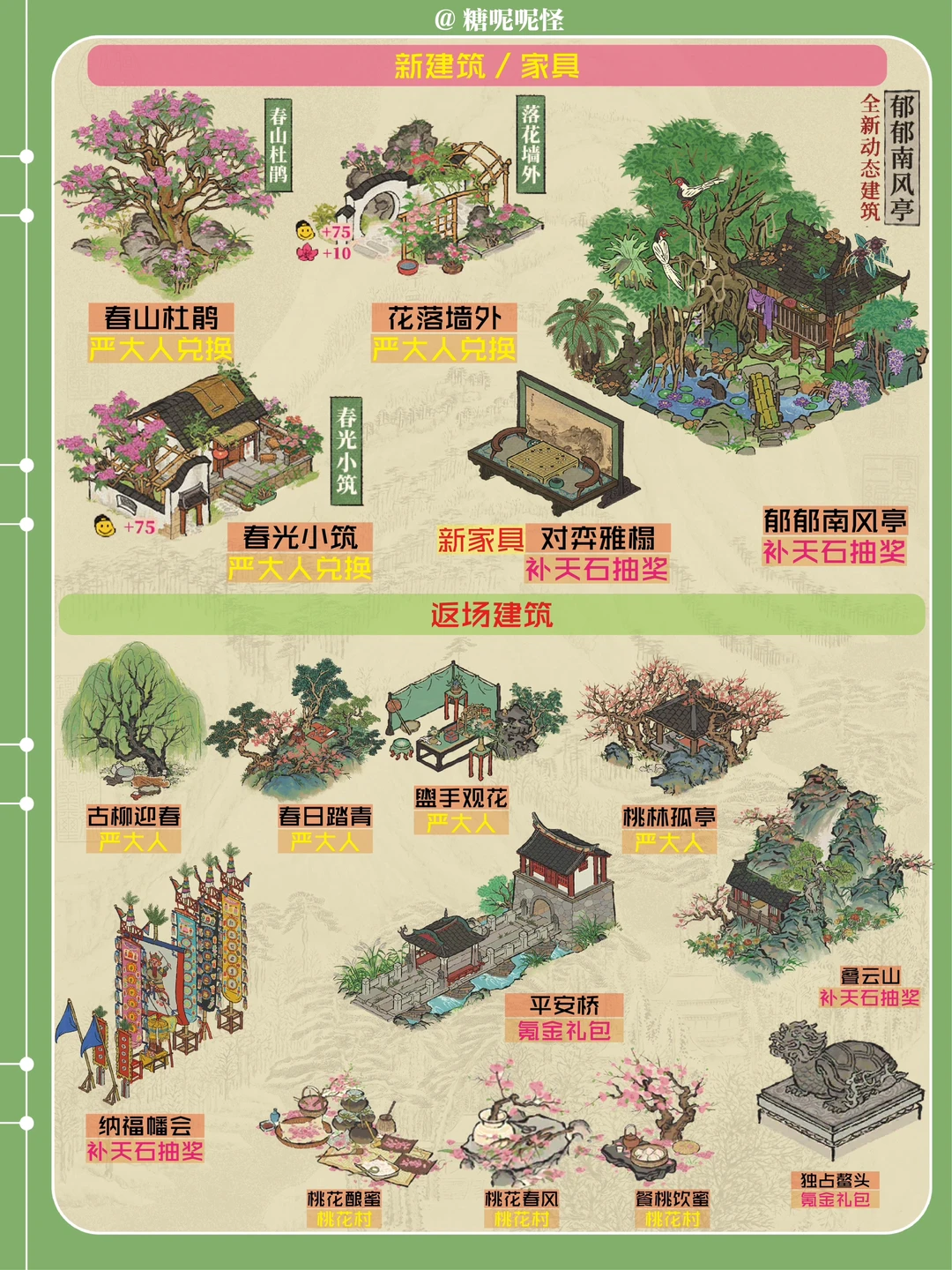 🌸新建筑: [一R]补天石抽奖:动态建筑-郁郁南风亭 [二R]严大人春季限定:春山杜鹃|花落墙外|春光小筑 [三R]新家具:对弈雅塌