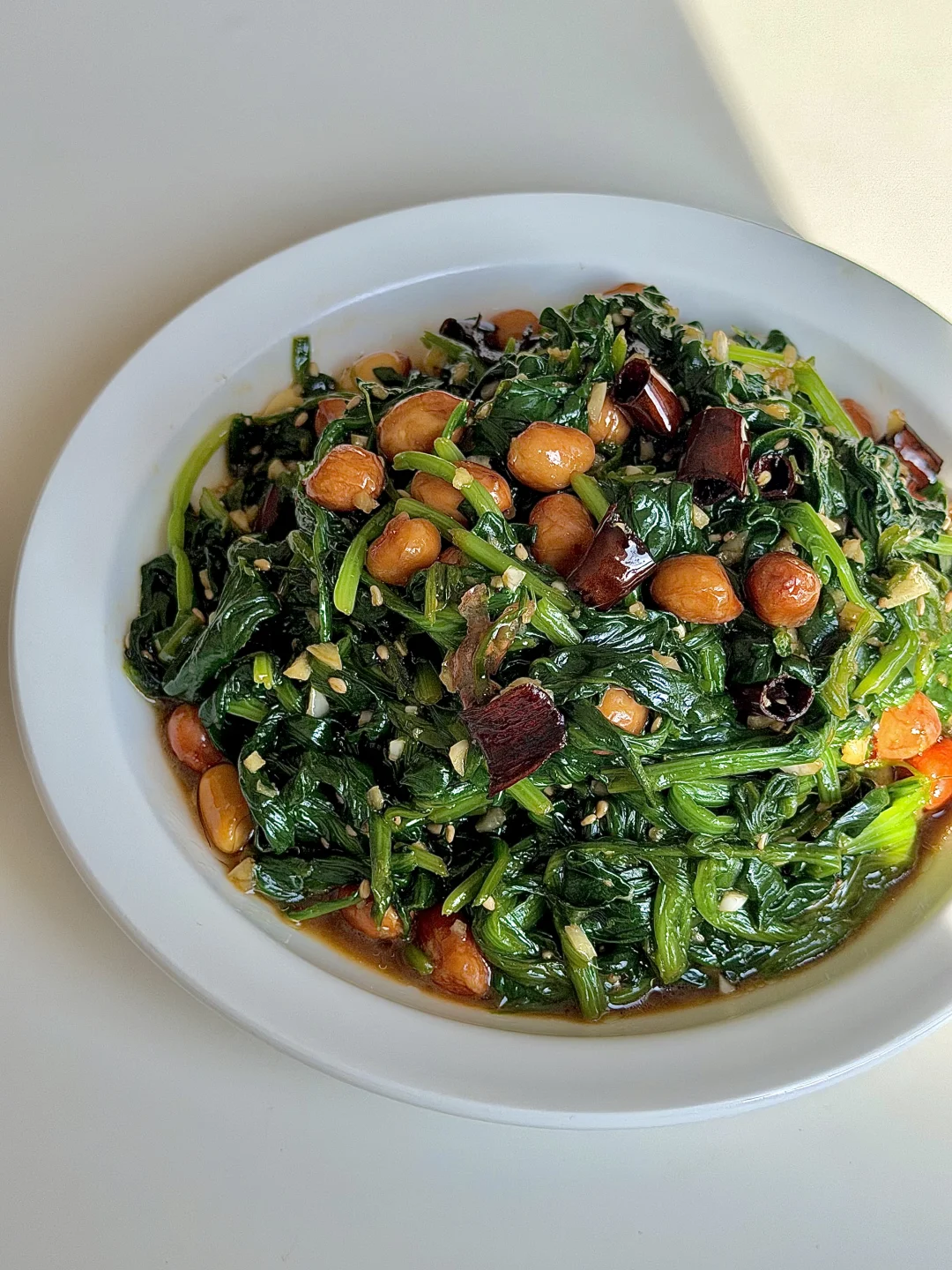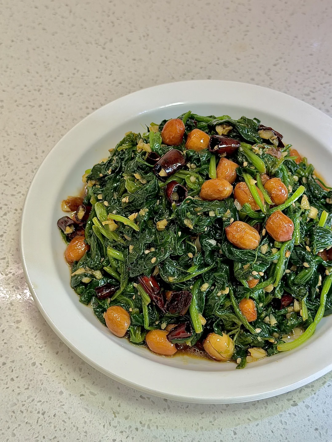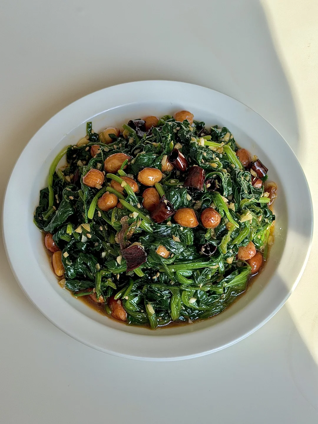 今日份美食分享: 果仁菠菜 . 食材:菠菜 花生米 做法如图上⬆️ . 简单的两种食材就能做出爽口的凉拌菜 真的真的巨好吃😋 年夜饭露一手吧!