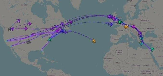 ❗过去48小时内,从美国驻欧洲基地飞往中东的飞机数量显著增加: