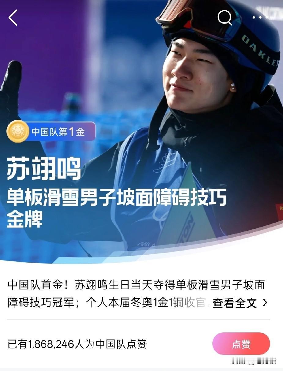 米兰冬奥会上,中国第一块金牌为中国亮仔苏翊鸣夺得!苏翊鸣成为冬奥会上最靓的中国仔,他为中国在米兰冬奥会上摘得了第一枚金牌。虽然说金牌并不是衡量运动员成功与否的唯一标准,但是所有的运动员参加比赛最终的目的,肯定都是冲着奖牌,更是为了获得金牌而去,因为金牌是衡量运动员价值的最大标准。经历了这么多天蛰伏,中国运动员终于迎来了这届奥运会第一块金牌,这块金牌给了这位 22 岁的清华大学天才运动员,在上一届冬奥会上,他获得了银牌,这一次冬奥会上,他再进一步,为中国代表团拿下第一枚金牌,成为最靓的仔。