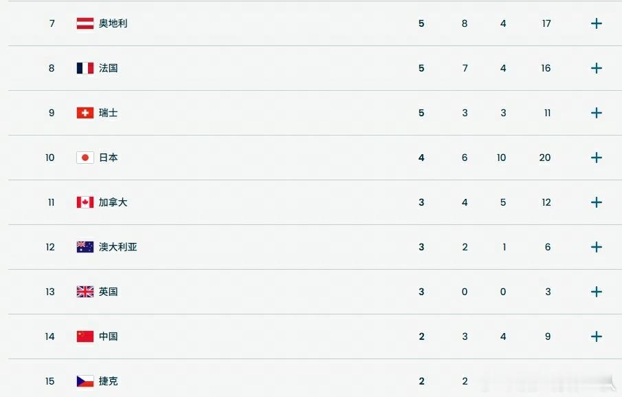 中国队升至奖牌榜第14位中国队2金3银4铜