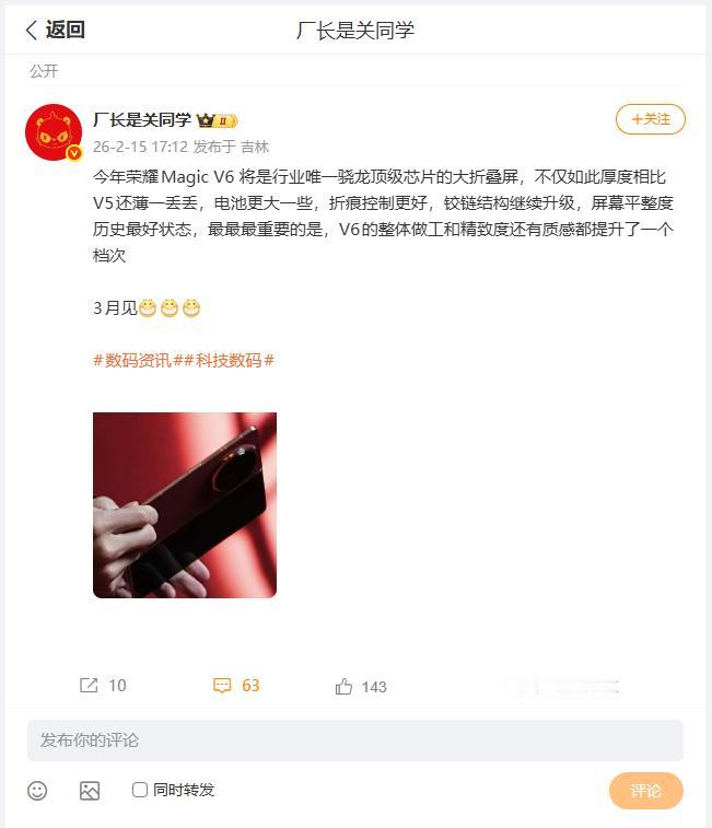 刚刚看到数码圈内大佬透露,荣耀关于即将于今年3月份发布的大折叠屏手机:荣耀Magic V6,大佬表示将会是行业唯一骁龙顶级芯片,厚度要比上代产品薄一些,内置的电池也会更大一些,铰链结构继续升级,屏幕折痕也会控制的更理想,这张照片的出处貌似我也找到了,大家看对不对呢?畅聊数码新品 数码资讯