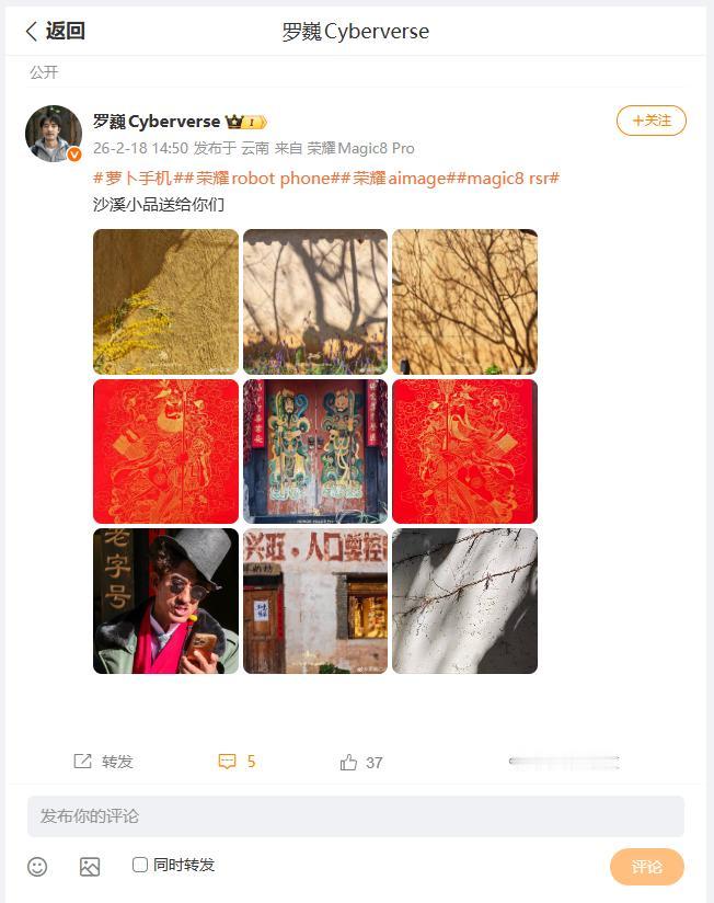 在这个新年假期中,大家有没有旅行的计划呢?不便出行的时候,通过大家分享的照片云旅行,也是蛮好的选择,荣耀首席影像工程师罗巍分享了一组,利用荣耀Magic8 Pro拍摄的沙溪人文,这款机型的镜头语音蛮深刻,搭配节日水印也提升了氛围感,罗工拍摄技术越来越好了,大家觉得怎么样呢?畅聊数码新品 数码资讯