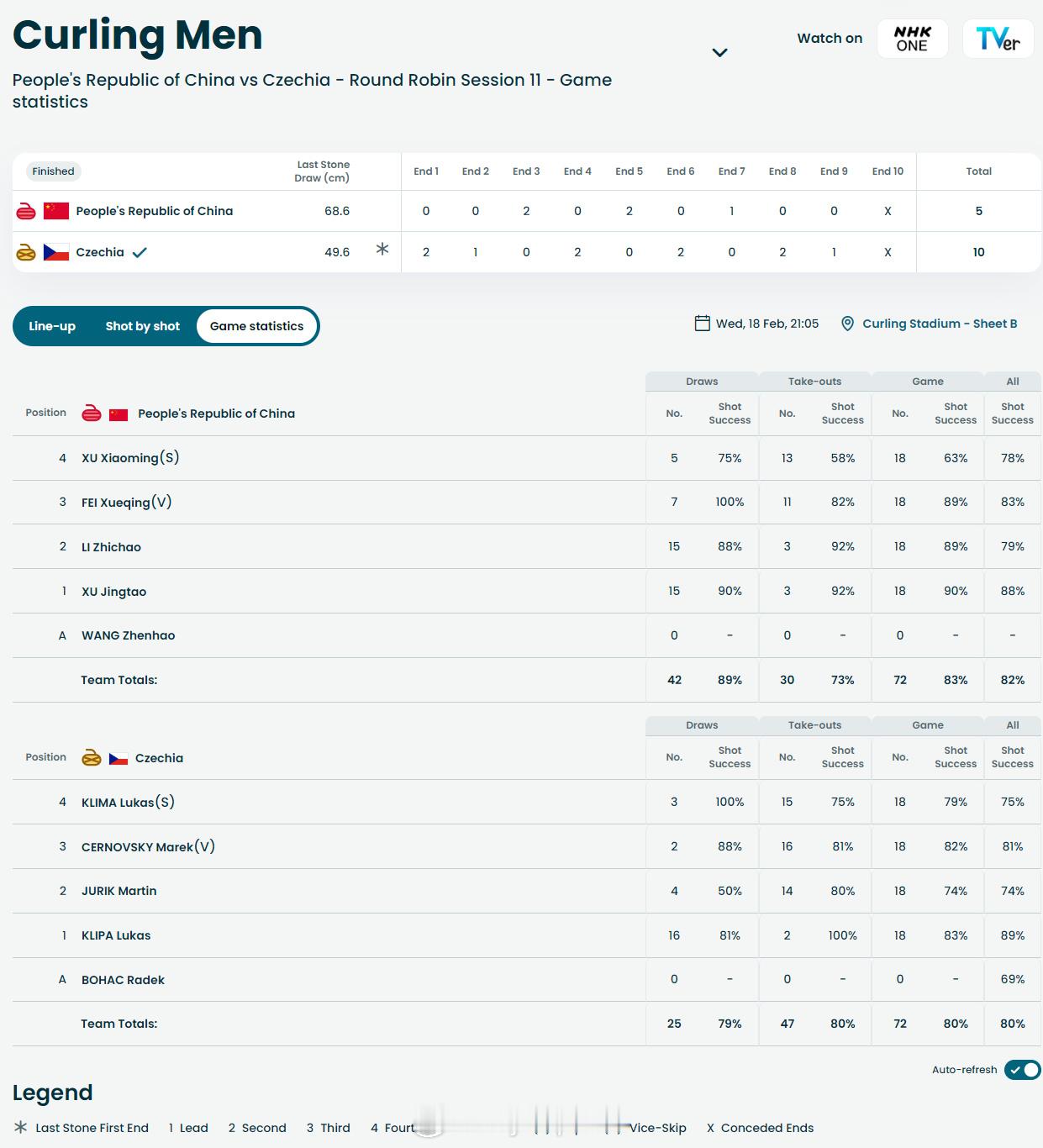 【冬奥男子冰壶中国5-10捷克 排名掉至榜尾】 冬奥会 2月18日,冬奥会男子冰壶循环赛倒数第二轮,中国队对阵倒数第一捷克,在第九局后,中国队5-10提前认负。八轮过后,中国队与瑞典和捷克同为2胜6负,因为胜负关系排名倒数第一。目前,瑞士和加拿大率先晋级半决赛。北京时间19日16:05,中国队将对阵最后一个对手3胜5负的德国。