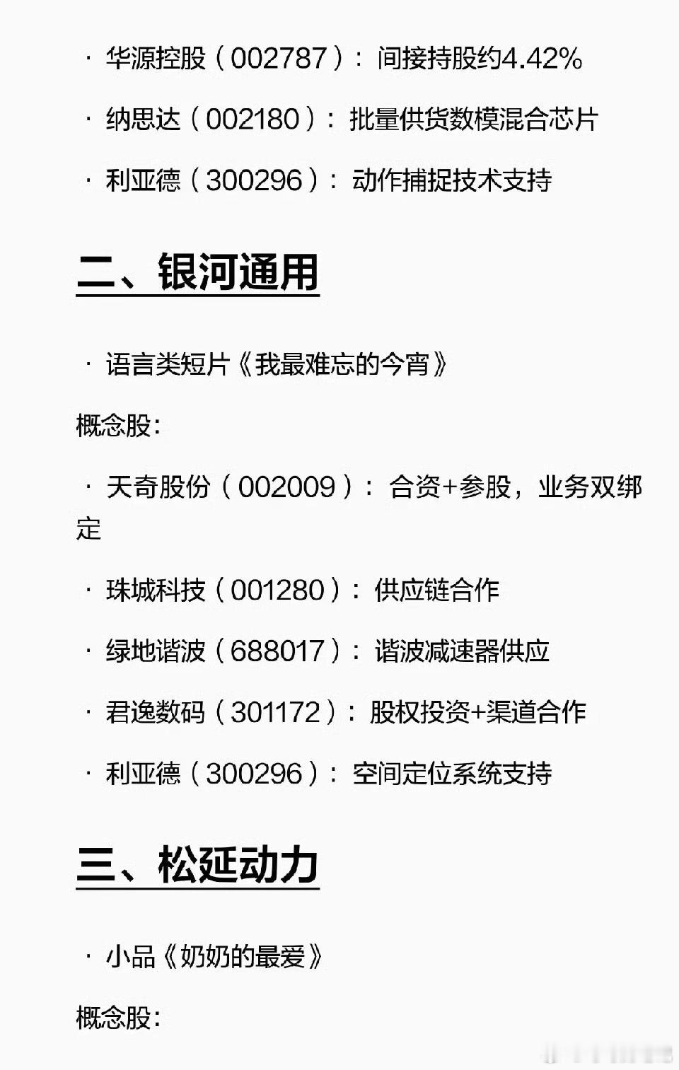 春晚四家机器人出镜概念股梳理:一、宇树代表:卧龙电驱、兆威机电、长盛轴承、利欧股份、金发科技、奥比中光、中大力德二、银河代表: 天奇股份、绿的谐波、百达股份、君逸数码、中大力德、均胜电子三、魔法代表:嘉美包装、五洲新春、苏州高新、长盛轴承、芯联集成、万马科技、北特科技、领益智造四、松延代表:三花智控、风语筑、达瑞电子、双环传动、慧辰股份、鸣志电器a股A股