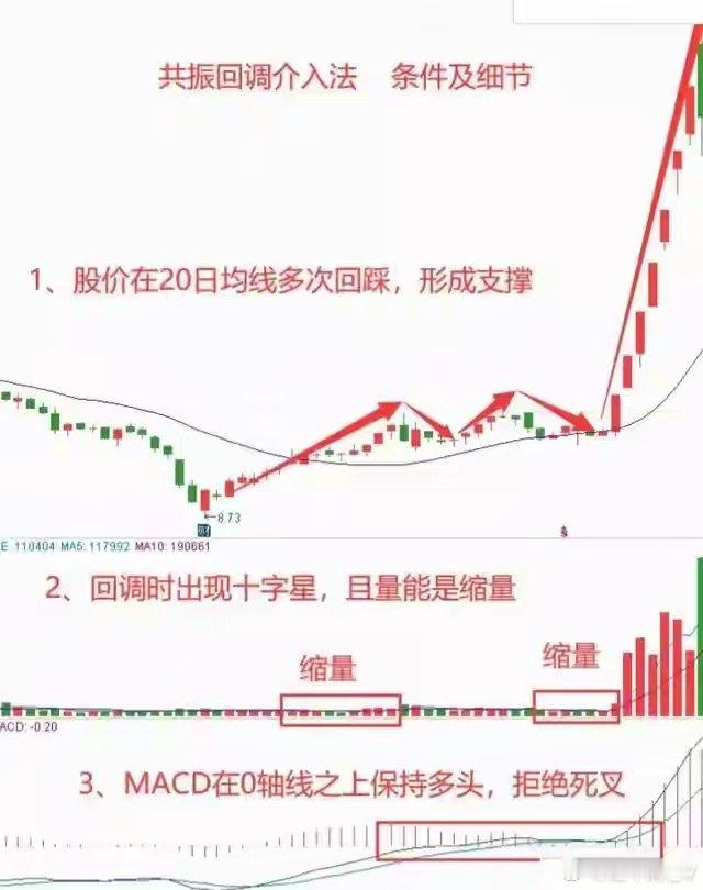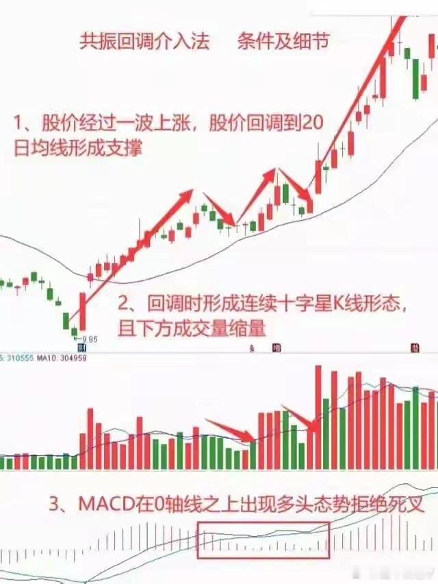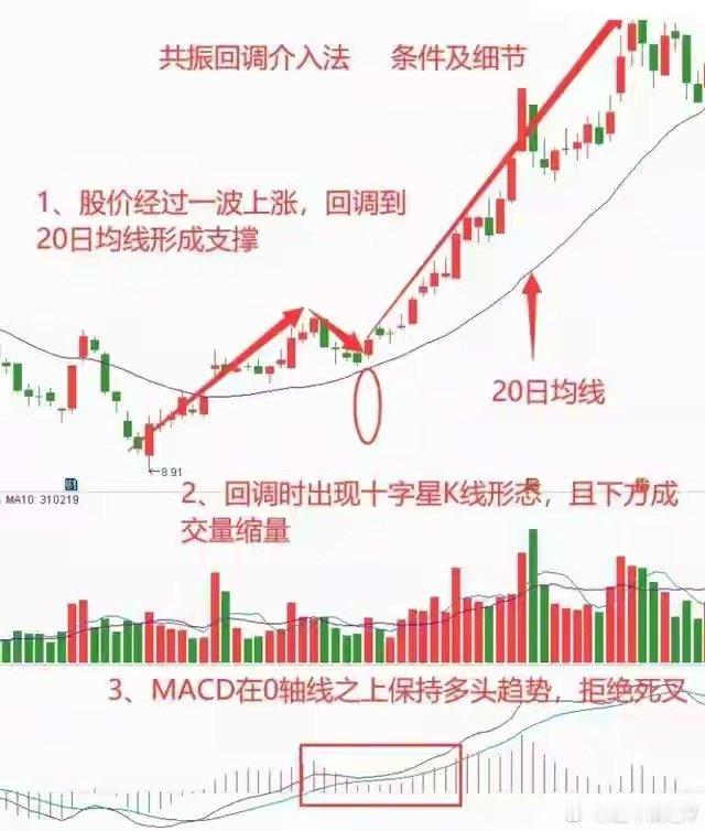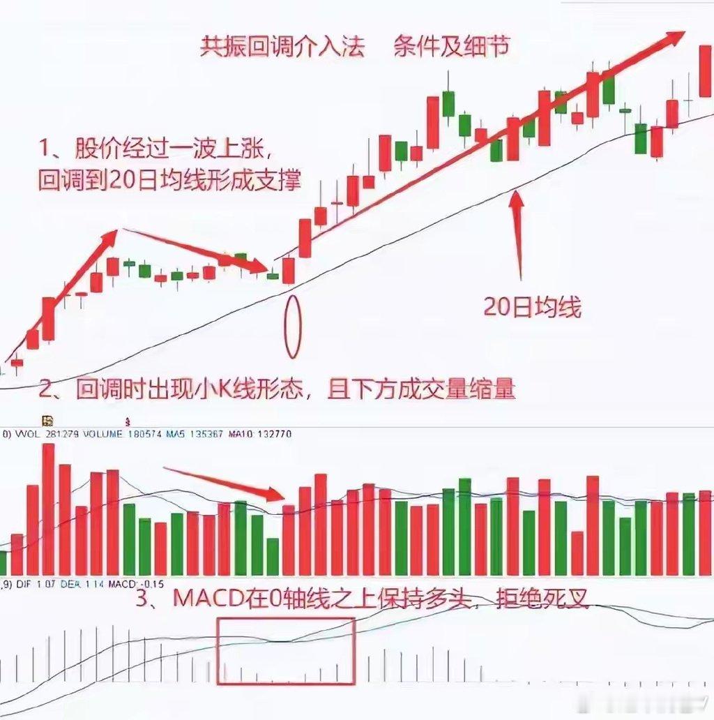 咱们混股市的,多少都听过这句话:“机会是跌出来的,风险是涨出来的。”话糙理不糙。买股票,千万别把自己搁在火堆边上烤,更别去赌那些扛不起的风险。只要进场时,风险是你兜得住的,那这一笔单子就值得考虑。不过话说回来,像咱们这种小散户,本金是一分一分攒出来的,谁也经不起大风大浪。来市场是为了赚钱,不是来找刺激的。所以啊,挑一个风险相对可控的位置下手,才是咱们该走的路。老鱼我在市场里也摸爬滚打了些年头,折腾来折腾去,最后发现——真正适合咱们稳着来的,反而是这种“回调买入”的玩法。想少踩坑、少被套的朋友,不妨花点心思琢磨琢磨,说不定能少交点学费。平时看盘,成交量和均线是躲不开的两样东西。而今天要讲的这套“回调买入”,关键就盯住一条线——20日均线。为什么盯它?因为这条线在实战里特别敏感。很多做中线的朋友,一旦看到股价跌破20日线,很容易动摇、减仓甚至清仓,趋势也就跟着拐头了。所以20日线,是区分上升通道和下降通道的一个重要参考。而当股价回踩到20日线附近,如果能配合成交量的变化和其他技术信号一起判断,往往能抓住一个比较舒服的进场点。自己复盘下来,这种位置的胜率确实偏高。那具体怎么用这套战法?几个细节大家记一下:第一,股票得处在上升趋势里。简单说,股价得老老实实在20日线上方跑。如果中途出现回调,踩着20日线回来,而且实体没有明显跌破这条线,同时K线形态上连续出现十字星,量能也跟着一天比一天缩——这往往是主力借着回调在洗盘,把拿不住的人震出去。第二,配合MACD看。这时候MACD如果在零轴上方走得很稳,拒绝形成死叉,甚至扭头变成金叉,那就要打起精神了。一旦后面股价放量冲过前高,或者拉出一根像样的放量阳线,基本就是动手的节点了。后面走出一波像样的行情,概率不小。