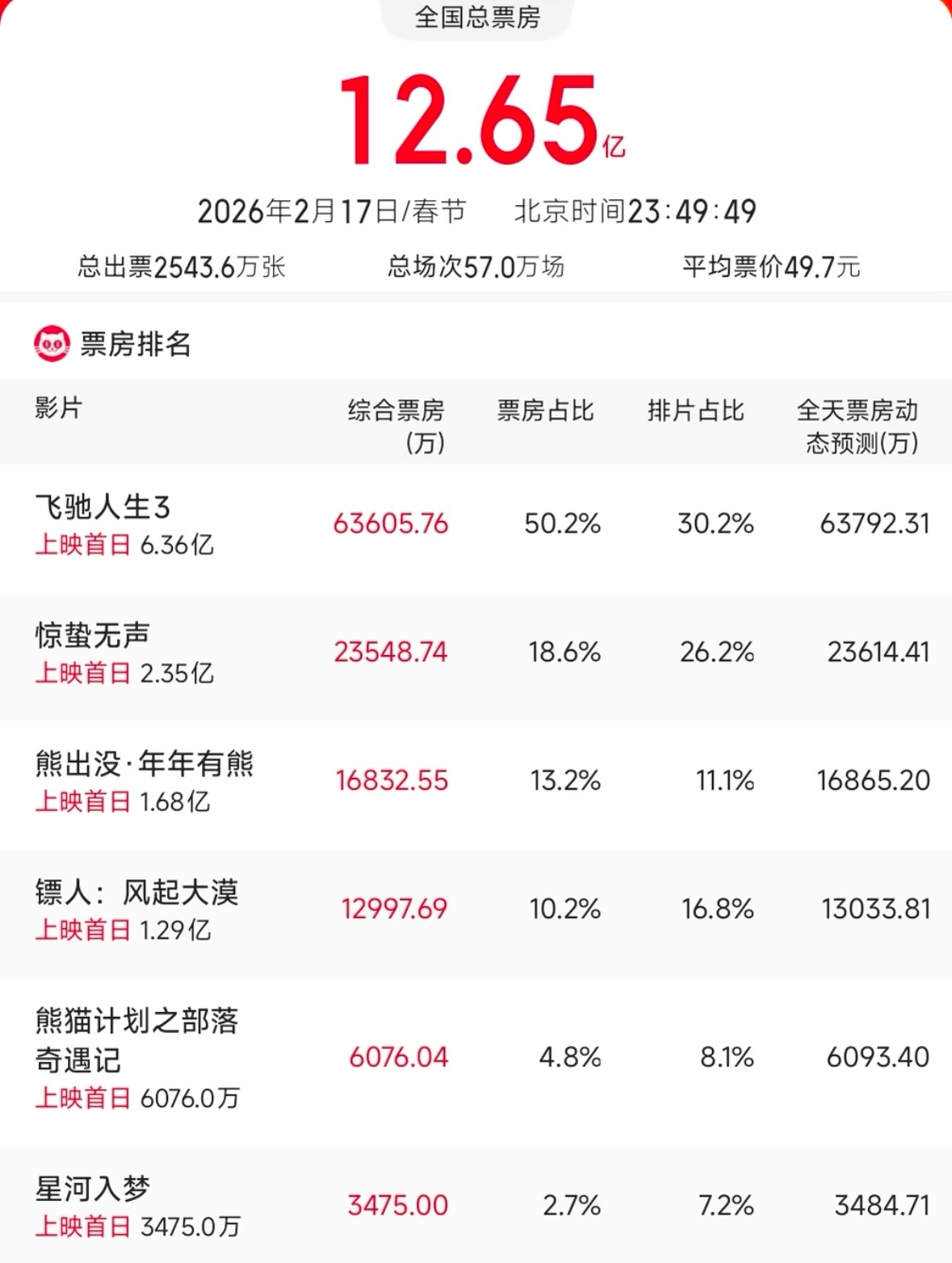 飞驰人生3飞驰人生第一天上映6亿票房,今天3亿。过了一天,票房占比还提高了!昨天去看了,还挺燃的,笑点也多,适合春节档。作为普通观众,可能题材不新,也不太能看懂车子相关的专业知识,看的就是个情节和氛围。唯一值得吐槽的是,春节档的电影票太贵了,比平时贵一半。第一排都被选完了,仔细一看原来是票价便宜。