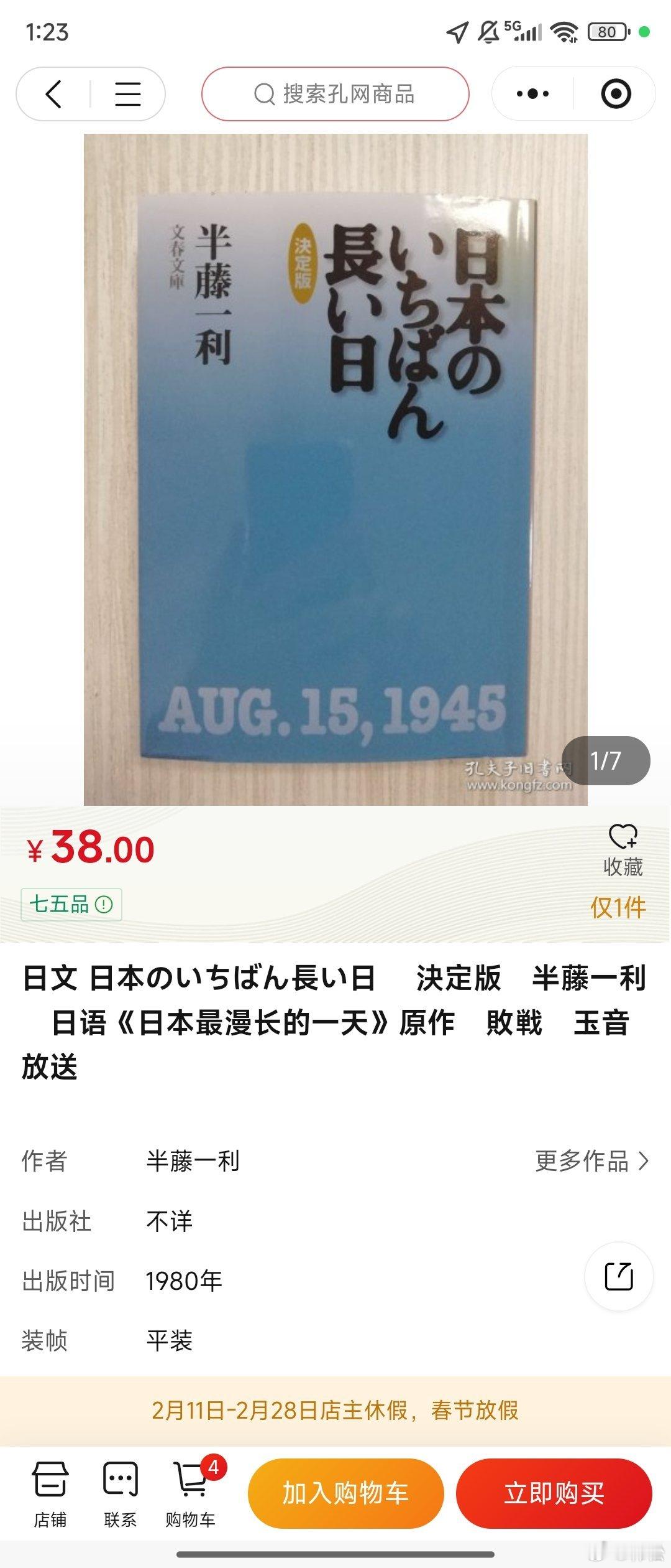 假期逢日本首相大选。读《日本最漫长的一天》,记录一九四五年八月十五号日本投降这天发生的事,“昭和史著作第一人”之称的半藤一利著,这是重庆出版社一九八九年的汉译本,而新的译本把书名译成《战败》。书中写到波茨坦公告发布和苏联出兵后,乃至广岛长崎两颗原子弹投下后,日本并没有完全决定投降,陆相、总长等仍请求进行本土决战,少壮军官还试图发动军事政变。书中提到美国时称其为“地球上突然冒出来的全能支配者”,还有裕仁天皇要求“必须忍难忍之事”。书中称八月十五号为日本的“二十四小时维新”,又提到“休战”“停战”“终战”“投降”“叛乱”“政变”等。这些词语在日文里,究竟是怎么写的呢?怀着好奇,从孔夫子网上购买了一九八零年的日文原版。