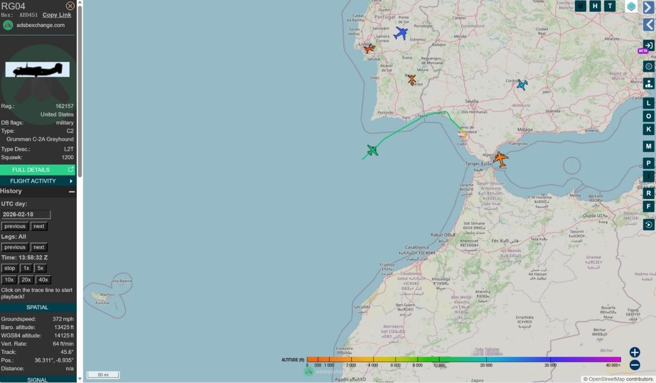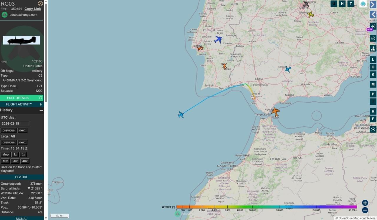 5天跨越大西洋,福特号抵达直布罗陀海峡附近——AIS信号以及C-2A的飞行活动显示,2月18号,美国海军福特号航母(CVN-78)已抵达直布罗陀海峡以西海域。