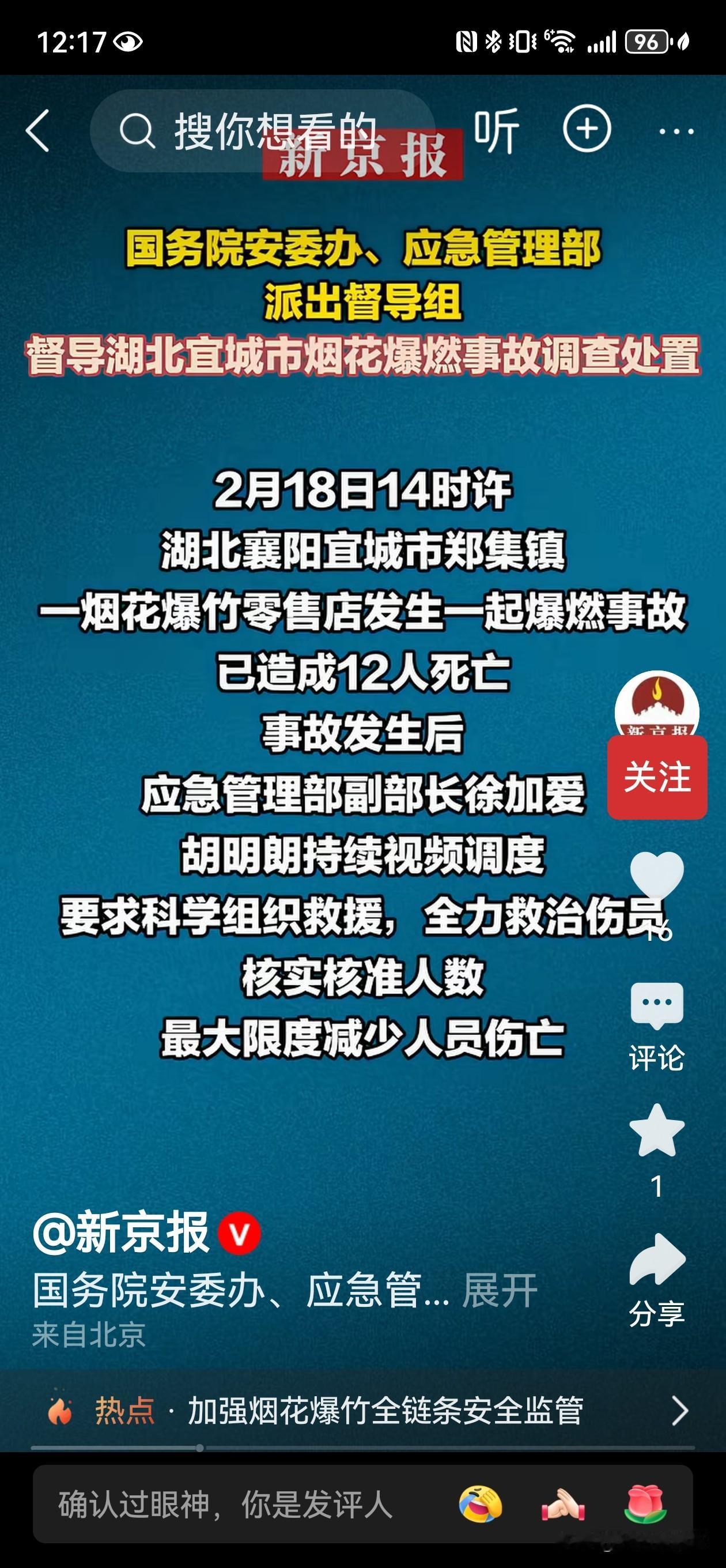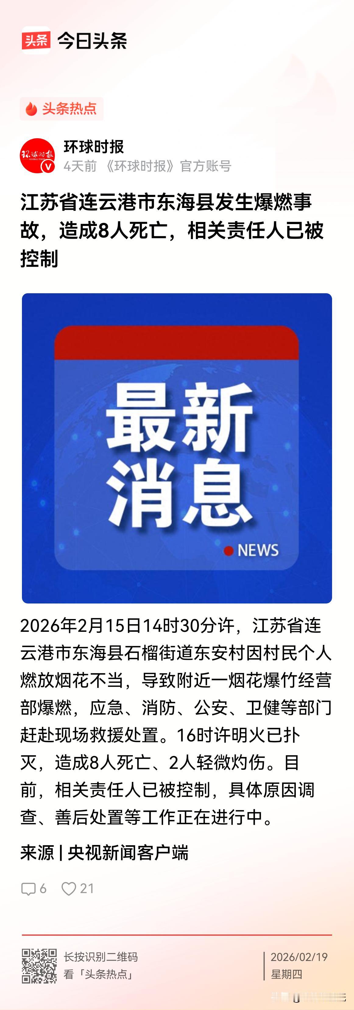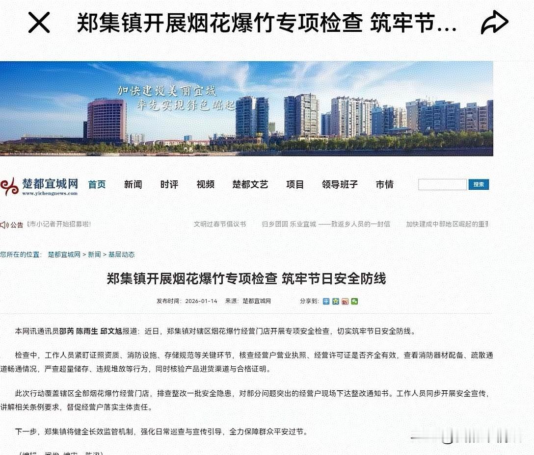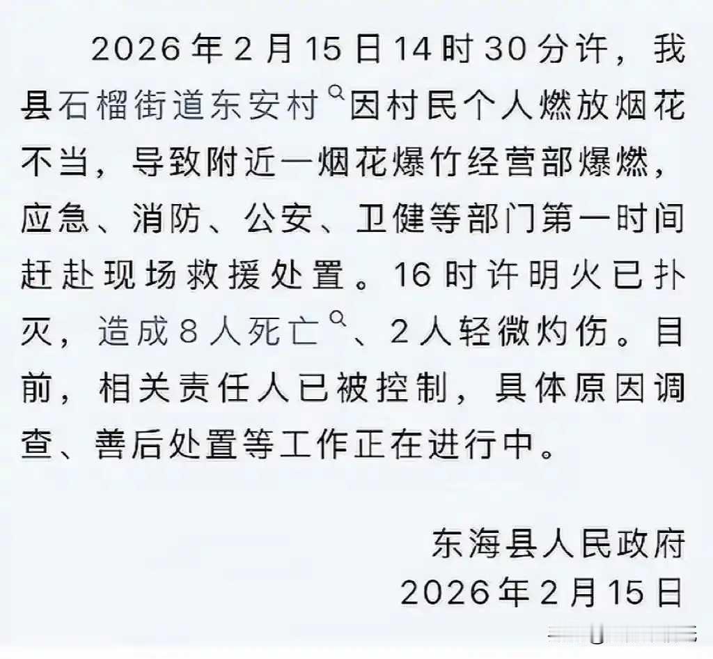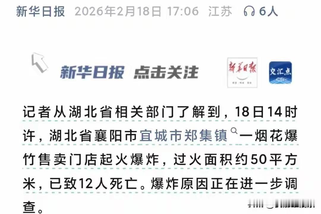 从腊月二十八8人到正月初二12人,短短4天内,两处烟花爆竹专卖店发生爆燃夺走20条人命,让人痛心不已。 先是江苏东海县,一家烟花爆竹专卖店附近因有人燃放引发爆燃,8人遇难;紧接着,湖北宜城又发生类似事故,12人死亡。 这两起事故惊人地相似——都发生在烟花爆竹专卖店里,都发生在年味正浓的时刻。宜城的过火面积仅50平方米,店面不大,却酿成如此惨重的伤亡,说明店内储存的烟花爆竹不仅数量惊人,威力也非同小可。更令人揪心的是,这家店楼上三层还住着人,楼下就是存放烟花的仓库,隐患早已埋下。 让人唏嘘的是,宜城郑集镇的这家店,在一个月前——1月14日,才刚刚接受过一次专项安全检查。当时,工作人员对全镇所有烟花爆竹经营门店进行了全面排查,紧盯证照资质、消防设施、存储规范等环节,还对部分问题突出的门店下发了整改通知书。检查覆盖了全部门店,整改了一批隐患,还专门做了安全宣传。可谁能想到,仅仅过了不到一个月,悲剧还是发生了。原因虽未最终查明,但相关责任恐怕难以推卸。 这些年,烟花爆竹的管理越来越严,大量无证门店被关停,剩下的都是有正规手续的合法经营点。但群众的购买需求并没有减少,反而因为合法门店少了,这些仅存的店铺只能大量囤货。加上年前年后是销售高峰,店里人来人往,空间本就有限,管理稍有松懈,风险便随之而来。更让人担心的是,不少烟花爆竹店与住宅相连,一旦出事,楼上的人根本来不及逃生。 正月初二是年后第二天,本该是走亲访友、欢欢喜喜的日子,却在烟火声中失去了生命。这两起事故,再次为烟花爆竹的安全管理敲响了警钟——越是节日,越不能麻痹大意。 而对“禁燃”与“放开”的争议来说,这两起事故也投下了沉重的阴影。放开之后如果管不住,收紧或许就成了必然的选择。只是,每一次收紧的背后,都是鲜血换来的教训。
