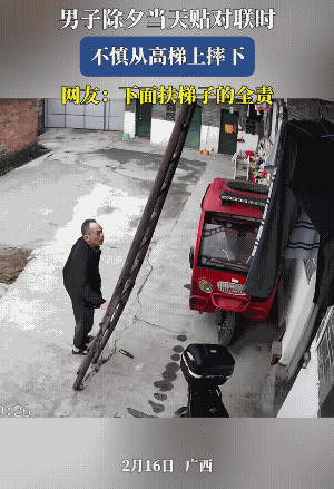 估计是站在最顶那个横杆上了,扶梯子的人没专心扶,上面的人,脚一用劲儿,导致梯子往外倒,他往里踩空了,就坠落了下来。 上梯干活,不仅横杆不过腰,而且更要防止扶梯子的人不尽心……