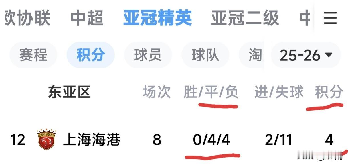 海港队在亚冠精英赛上,终究没让球迷失望。那中超冠军的头衔,依旧闪耀夺目。 亚冠精英赛场上,海港队四平、四负、仅积四分。这成绩,让球迷不禁联想到“四季发财”这个中国成语,实在是太贴切、太巧合、太不可思议了!仿佛海港队把“4”这个数字深深烙印在了骨子里。 可不是嘛,一年有四季、一月有四周、人生有四喜、名著有四部、中国有四大发明。这和“4”的缘分,真是满得不能再满了。海港队这是整出了玄学名场面?纯粹是跟“4”较上劲了。 海港队这成绩,在亚冠精英联赛东亚区处于垫底水平,也是中超冠军外战史上极为糟糕的表现。 8战4平4负,一场未胜,仅积4分,在东亚区12支球队中排名倒数第一,是全赛区唯一一场未胜的球队。 这一成绩,必将载入亚冠精英赛的史册。
