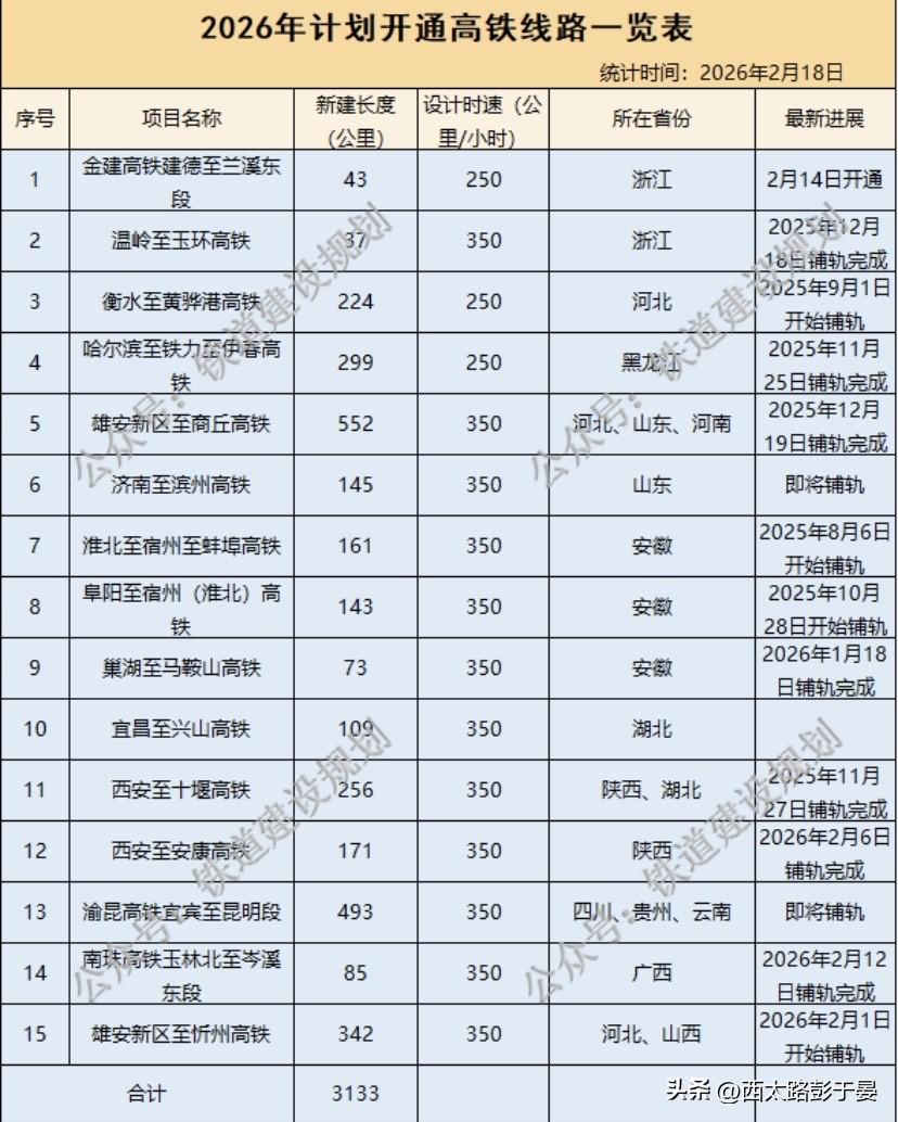 2026高铁大年!14条新线齐发,西安米字成型、八纵八横打通 1月26日,铁科院集团公司正式发布2026年铁路联调联试项目中标公告,明确西十、西康、哈伊、南深(玉林至岑溪段)、阜淮、渝昆(宜宾至昆明段)6条重点高铁,将在2026年全面启动联调联试,标志着这批线路正式进入开通倒计时! 十五五开局,中国高铁迎来爆发年!2月14日金建高铁兰建段开通,成为十五五首条运营高铁,年内10余条新线密集通车,联调联试里程超2000公里,路网格局全面升级。 今年共有14条高铁启动联调联试,涵盖雄商、西十、西康、哈伊、渝昆等重点项目。多数线路已完成铺轨,即将进入静态验收,已铺轨项目有望9月底前开通,年底前全部具备通车条件。 四大通道打通断头路: 京港+西武全线贯通,西安米字高铁八向闭合,坐稳全国第二米字枢纽; 渝昆宜昆段通车,西安→昆明10.5h→6.5h; 沿江高铁武渝段打通,5h→4h内; 雄忻高铁开通,山西首条350km/h,雄安西向、南向通道全开。 结束多城无高铁历史: 安康、商洛、滨州、伊春、绥化、沧州、马鞍山首通高铁,皖北阜淮宿蚌4市互联互通,跨省出行直达省会。 重点项目进度拉满: 雄商高铁552公里,2月1日启动静态验收,进展最快; 温玉高铁7年磨一剑,力争6月底开通; 哈伊、西十、西康等5条已铺轨,上半年迎验收。 从通路网到强枢纽,2026中国高铁再提速,回家路更近、出行圈更广!