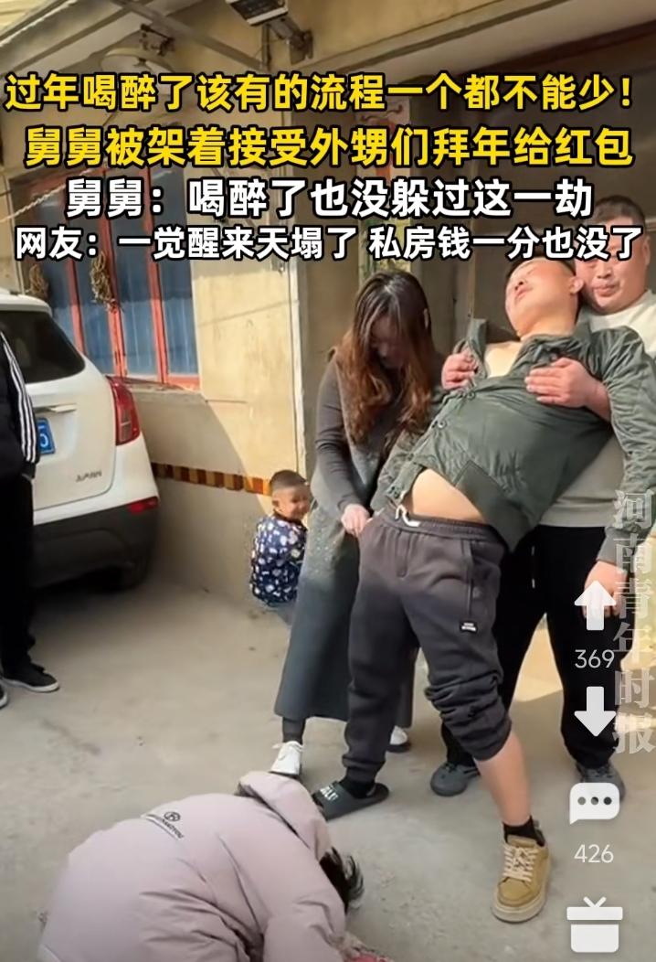 初二回娘家,一家子七八个兄妹一齐回来,各带一帮子侄外甥。 大舅知道免不了要破财,早早就把自己灌醉。 没想到兄弟姐妹不依了,硬是架着烂醉如泥的大舅接受子侄外甥们的拜年。大姐则在一旁从大舅的裤袋里掏出红包派发。 唉,正是你有你的张良计,我有我的过云梯。 想省红包?没门! 一个都不能少,一张也不能少!