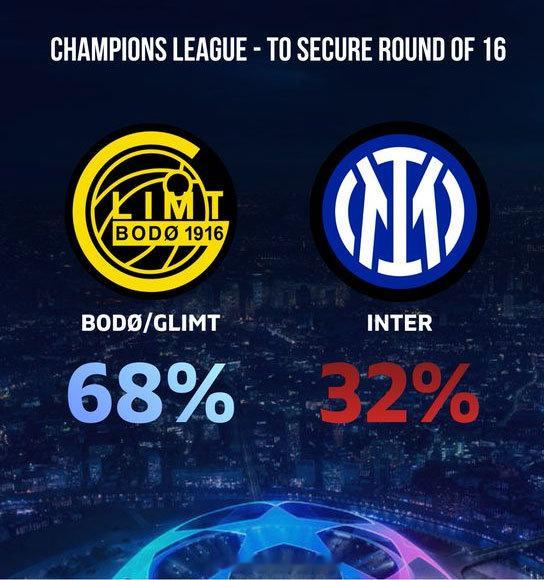 【国米翻盘难度大】欧冠16强附加赛首回合,博德闪耀3比1国米,赛后大数据分析显示,次回合国米成功翻盘的机率只有32%,博德闪耀成功晋级16强的机率高达68%。