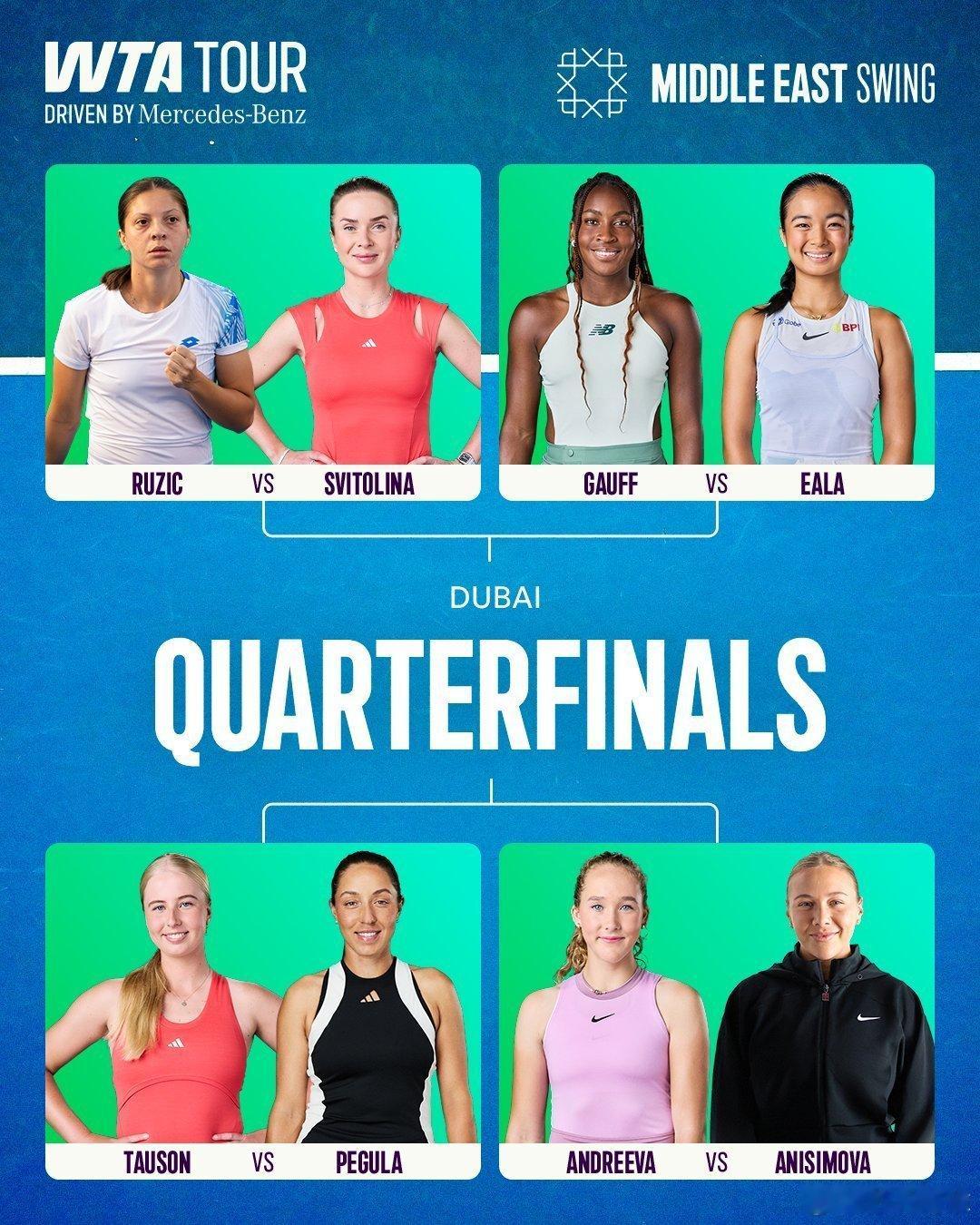 WTA1000迪拜八强对阵18:00,🇺🇸佩古拉vs陶森🇩🇰19:30,🇺🇸阿尼西莫娃vs米安德烈娃🇷🇺23:00,🇺🇸高芙vs伊埃拉🇵🇭00:30,🇺🇦斯维托丽娜vs鲁季奇🇭🇷三场遭遇战,只有阿尼西莫娃和安德烈娃是第二次交手,阿尼1-0领先。你看好的半决赛阵容会是?