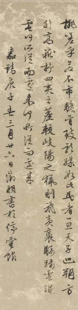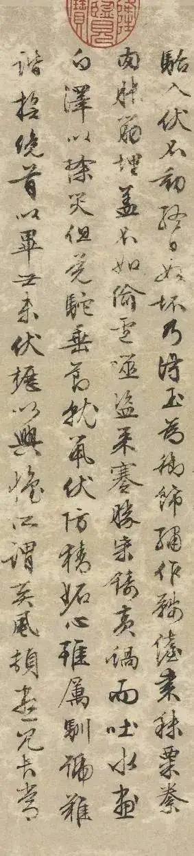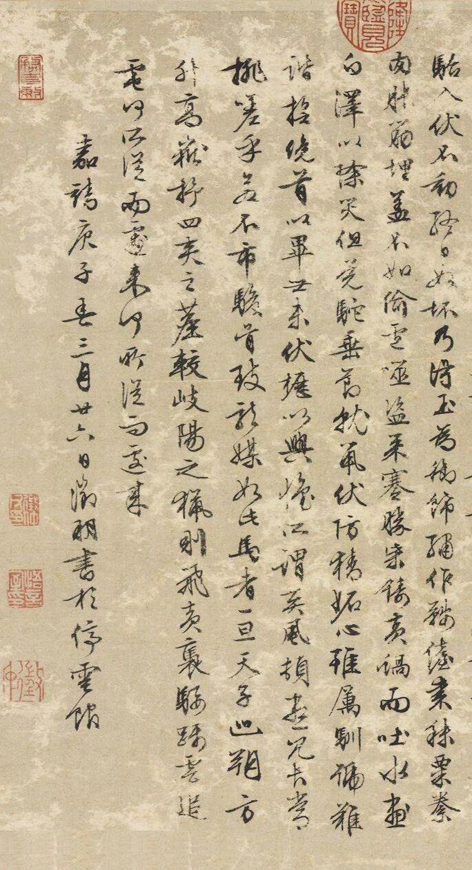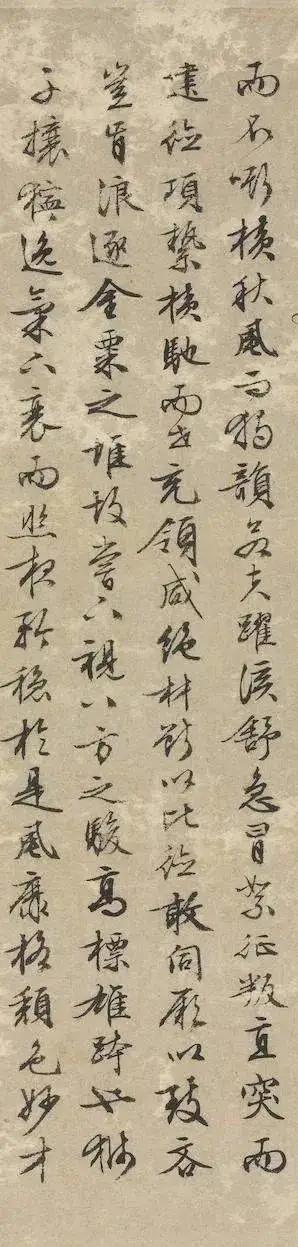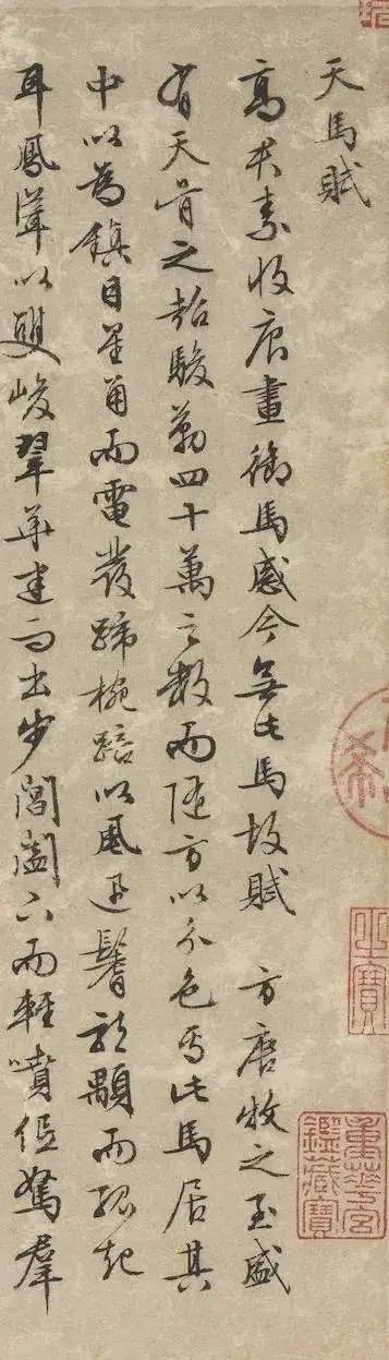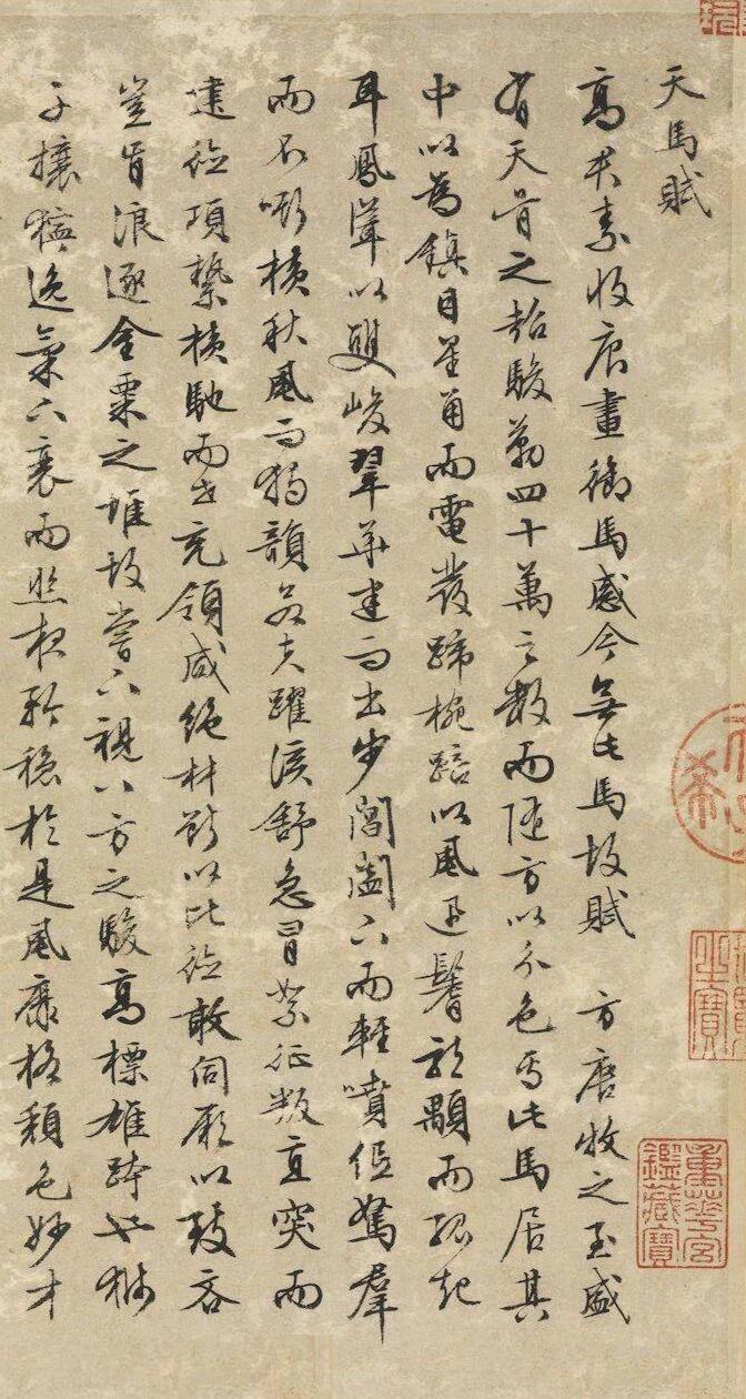 文徴明行书《天马赋》是为明代仇英双骏图轴所作的题跋,现藏于台北故宫博物院藏。作写作时,文徵明七十岁。文徵明与仇英常被并称为“明四家”(亦称“吴门四家”、“吴门四杰”)中的两位。“明四家”是指明代中叶活跃于苏州地区的四位代表性画家:沈周、文徵明、唐寅、仇英。文徴明不仅仅是画家,其诗文方面迹造询深厚,其书法方面更是炉火纯青,形成文式书法特色,对后世书法发展亦影响深远。今天看到的《天马赋》,是文徴明自创赋文,自书书法,与仇英的画形成艺术双璧。此画与书作价值连城!