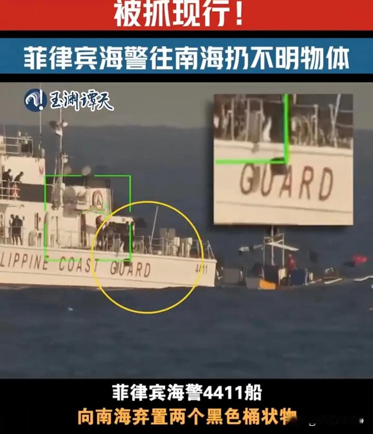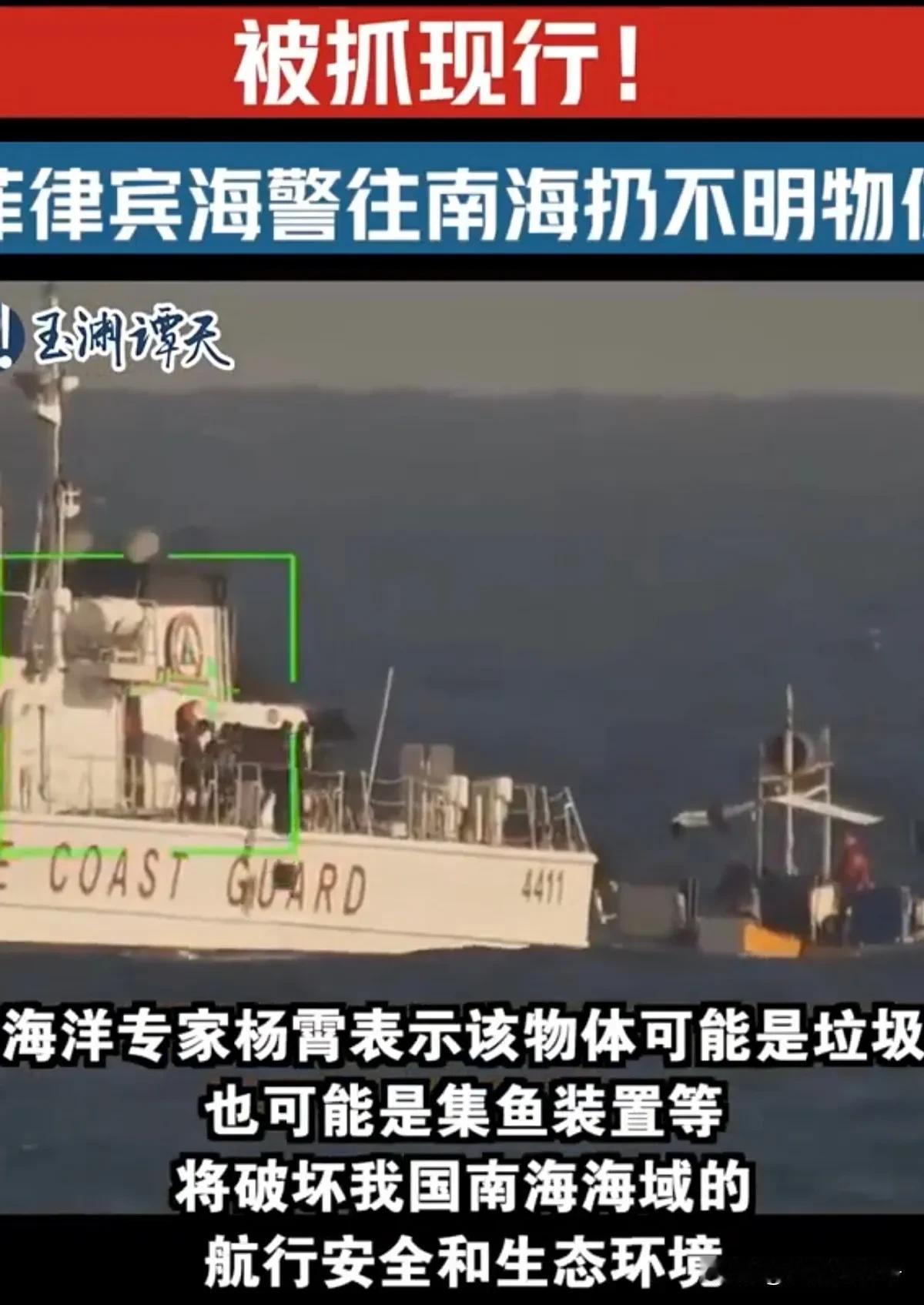 现场让咱们抓包了,菲律宾海警4411船,偷偷的往南海丢了两个黑色的大桶 现场视频被咱们清晰的录了下来,这是2月16号的事情 那么他们到底丢了个什么东西?官方猜测可能是船上的垃圾,也有可能是集鱼装置 可能很多人对这种装置比较陌生,在这里简单的介绍一下 这种东西属于是深海里的鱼群诱骗器 它会模拟出一部分鱼群所喜欢的气泡,声呐,光线,等等环境 让鱼群集中起来,方便捕捞 这本来是远洋渔业经常用的一种设备,那么菲律宾的海警丢这个东西有什么用呢? 难道是要捕捞南海地区的一些珍稀的海洋生物吗? 他要破坏海洋生态? 个人感觉很有可能他丢的是一些海底的监听设备,或者监控设备 没准就是美国提供的,这种可能性应该更高 其实遇到这种情况,咱们海警就应该冲上去,以乱丢垃圾罪名,将他们全部逮捕 保护环境,人人有责嘛