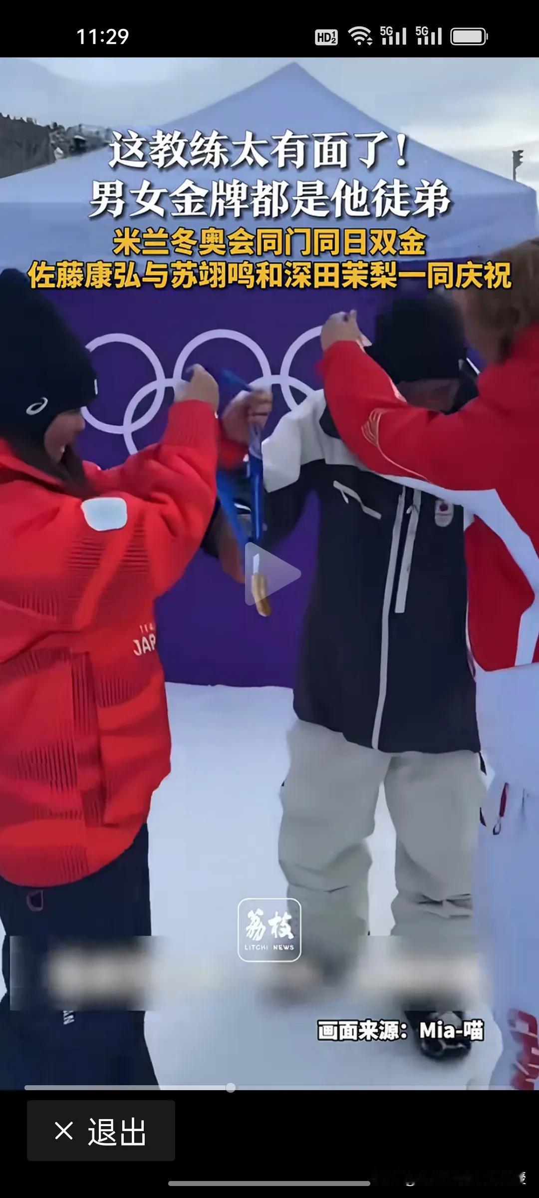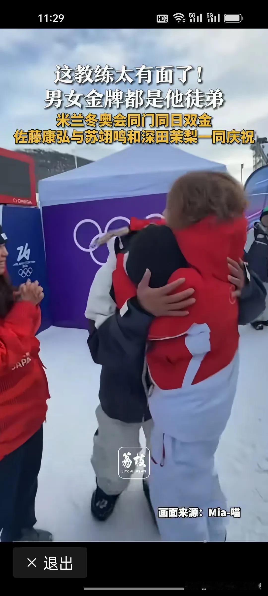 当苏翊鸣夺冠时,有一个日本人比他更高兴!看下图,当苏翊鸣和深田荣梨在米兰冬奥同日同项目摘金,镜头里那个振臂高呼的日本男人,正是“双金教父”——佐藤康弘。 1. 他是日本单板滑雪的传奇教头,曾带出鬼冢雅等顶尖选手,2018年受邀执教中国队,从苏翊鸣14岁起陪伴他从璞玉雕琢成世界冠军。 2. 八年师徒情,他用专业和信任跨越国界,疫情期间远程指导,赛场边跪地祈祷,把“先成人后成才”的理念刻进苏翊鸣的成长里。 3. 如今男女金牌同归门下,两位冠军都把金牌给自己的教练戴上表示感谢,佐藤康弘用实力证明:体育无国界,好教练能让不同国家的少年,站上同一片巅峰。 在当下复杂的中日关系背景下,这样的师徒情更显珍贵。