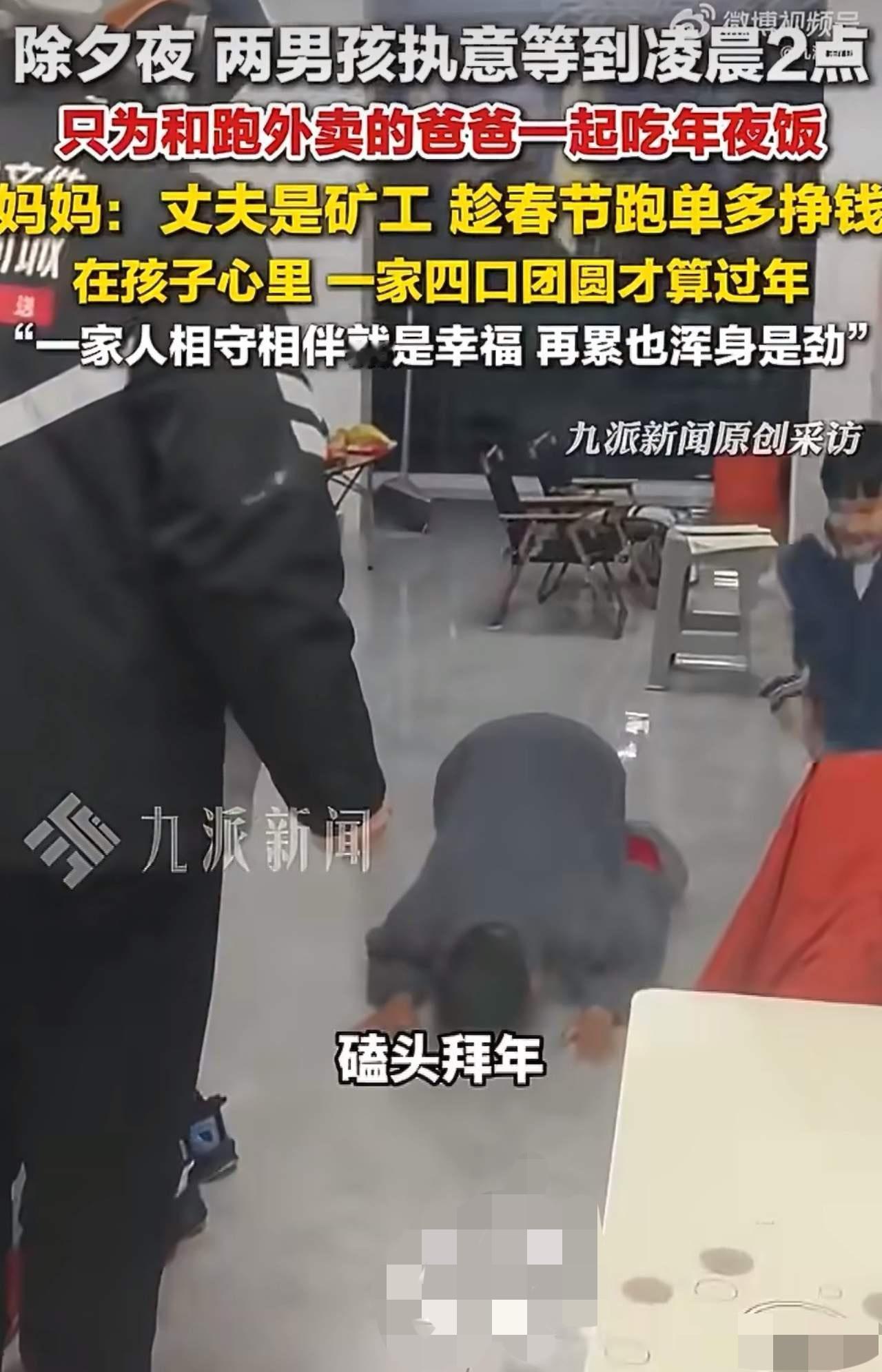除夕夜最戳人的从不是山珍海味,而是一家人整整齐齐等你回家吃饭! 安徽马鞍山当涂的这一幕,直接看哭无数普通人。 爸爸是矿工,春节假期和妻子一起跑外卖多挣点钱,连续三年没能零点吃上年夜饭。13岁和8岁的兄弟俩,说啥都不肯先动筷子,就啃点干果硬熬到凌晨两点。 他们不要新衣服,也没提红包,心里就认一个理:一家四口团圆,才叫过年。爸爸进门那一刻,孩子主动磕头拜年,这碗迟来的年夜饭,比任何盛宴都暖。 真正的幸福从来不是大富大贵,是有人懂你的辛苦,等你归途,把平凡日子过成最暖的团圆。 马鞍山头条