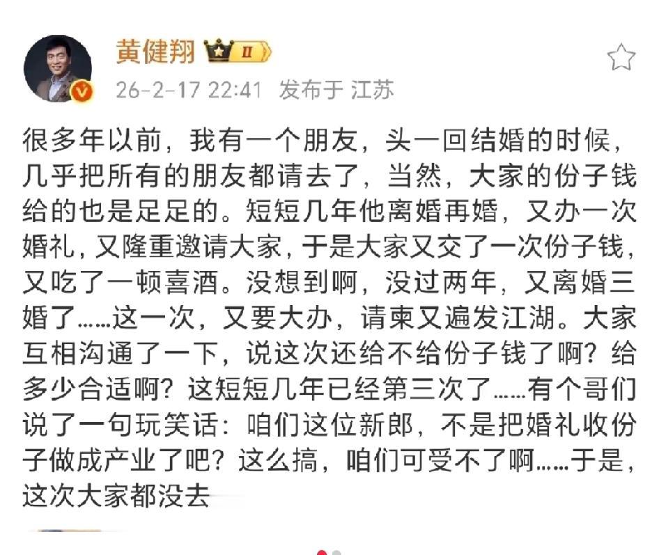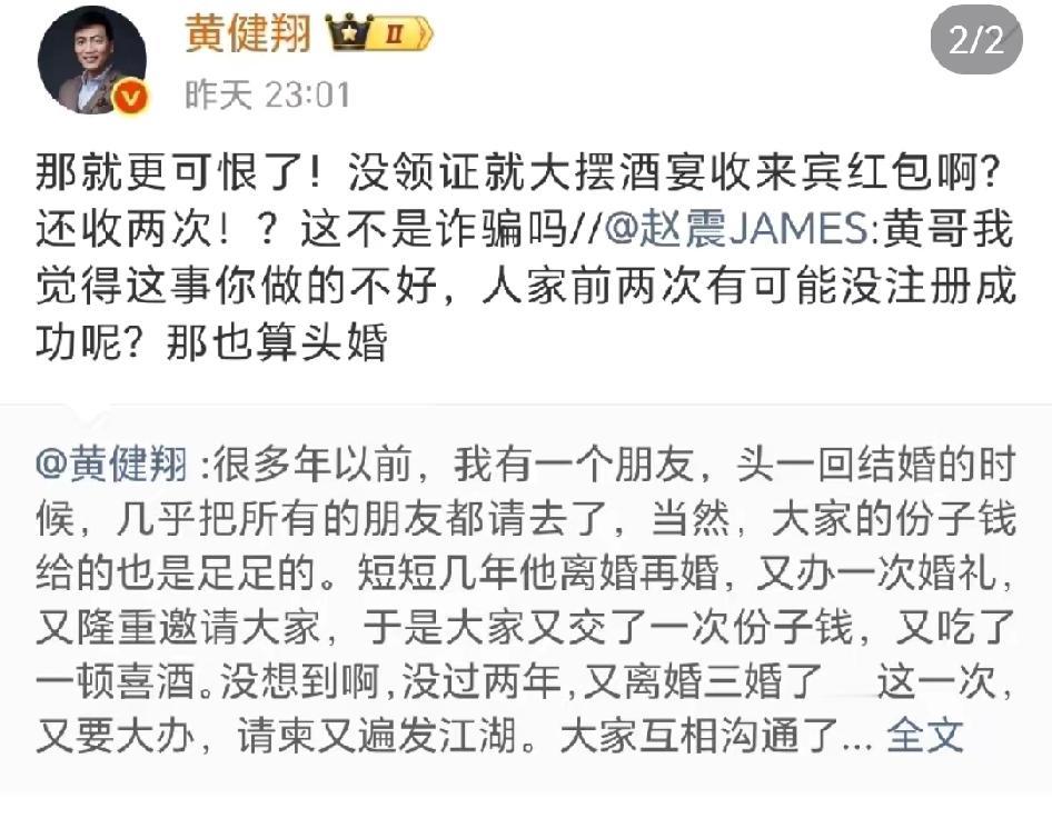 黄健翔吐槽朋友三婚要随份子三次。直言受不了,这次大家都没去。 说实话,正经人结婚三次的确实不多。结婚三次还大张旗鼓办婚礼并且邀请朋友参加的估计更少了。 你真邀请也没问题,提前跟朋友说好,不收彩礼,这才是正道。