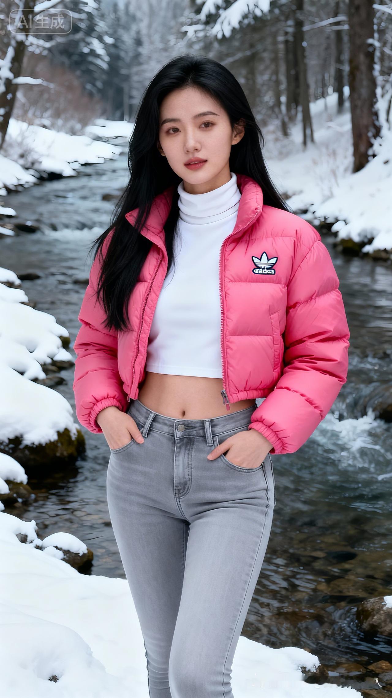 冬日森林中的少女,粉色羽绒服与雪景相映成趣