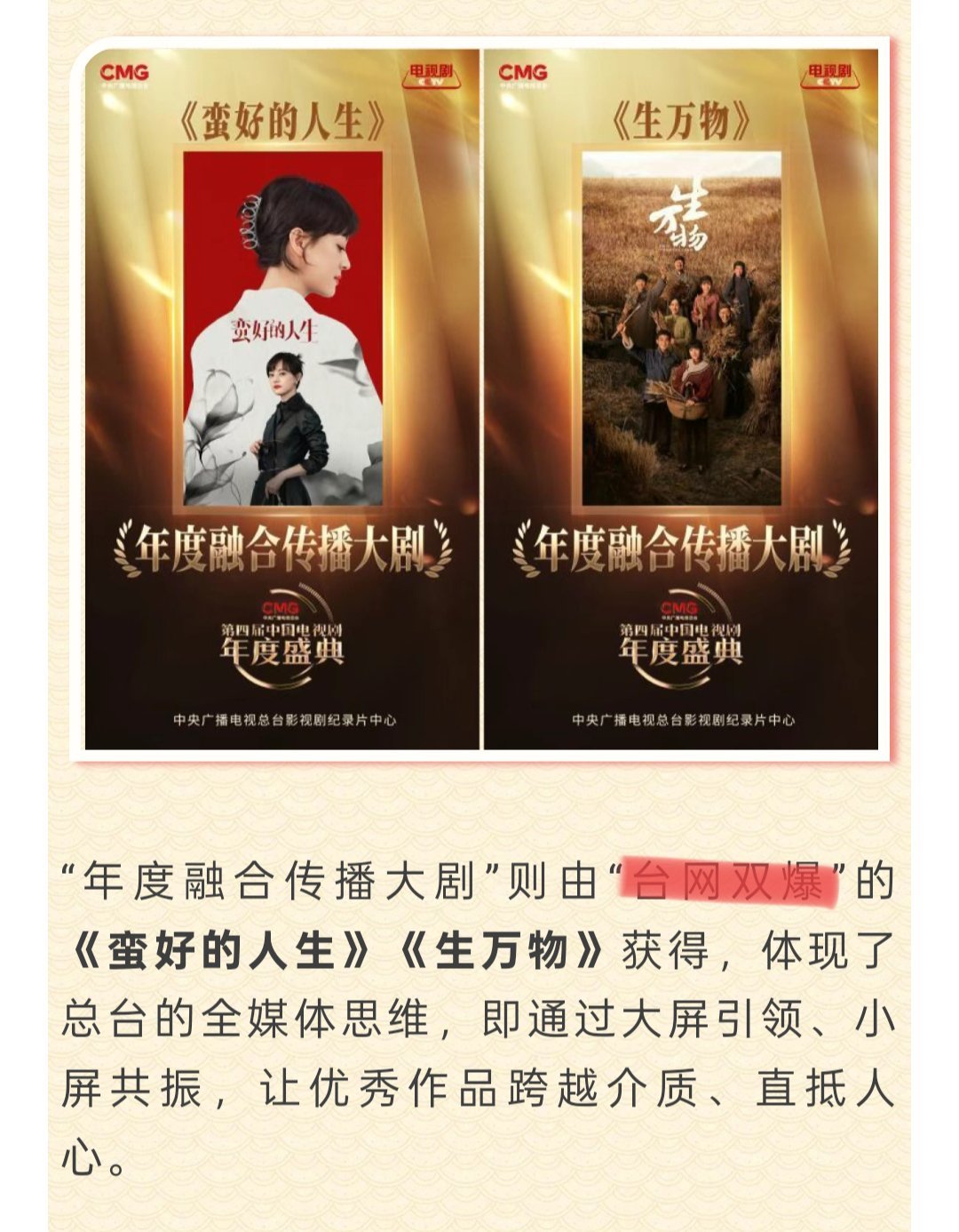 “年度融合传播大剧”由台网双爆的生万物获得。