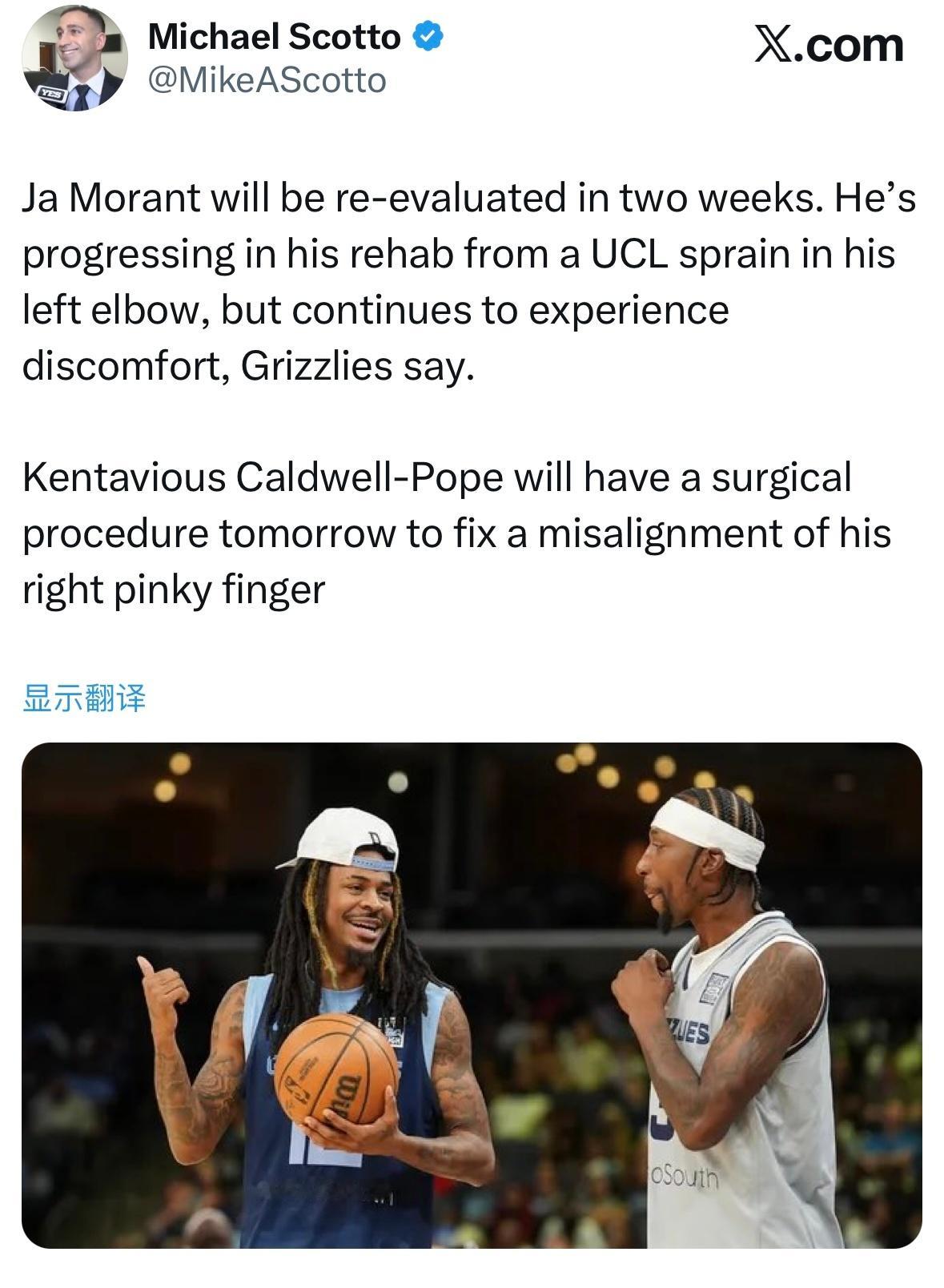 灰熊官方表示:莫兰特将在两周后接受伤情复查。他左肘尺侧副韧带扭伤的康复过程正在取得进展,但仍感到不适。