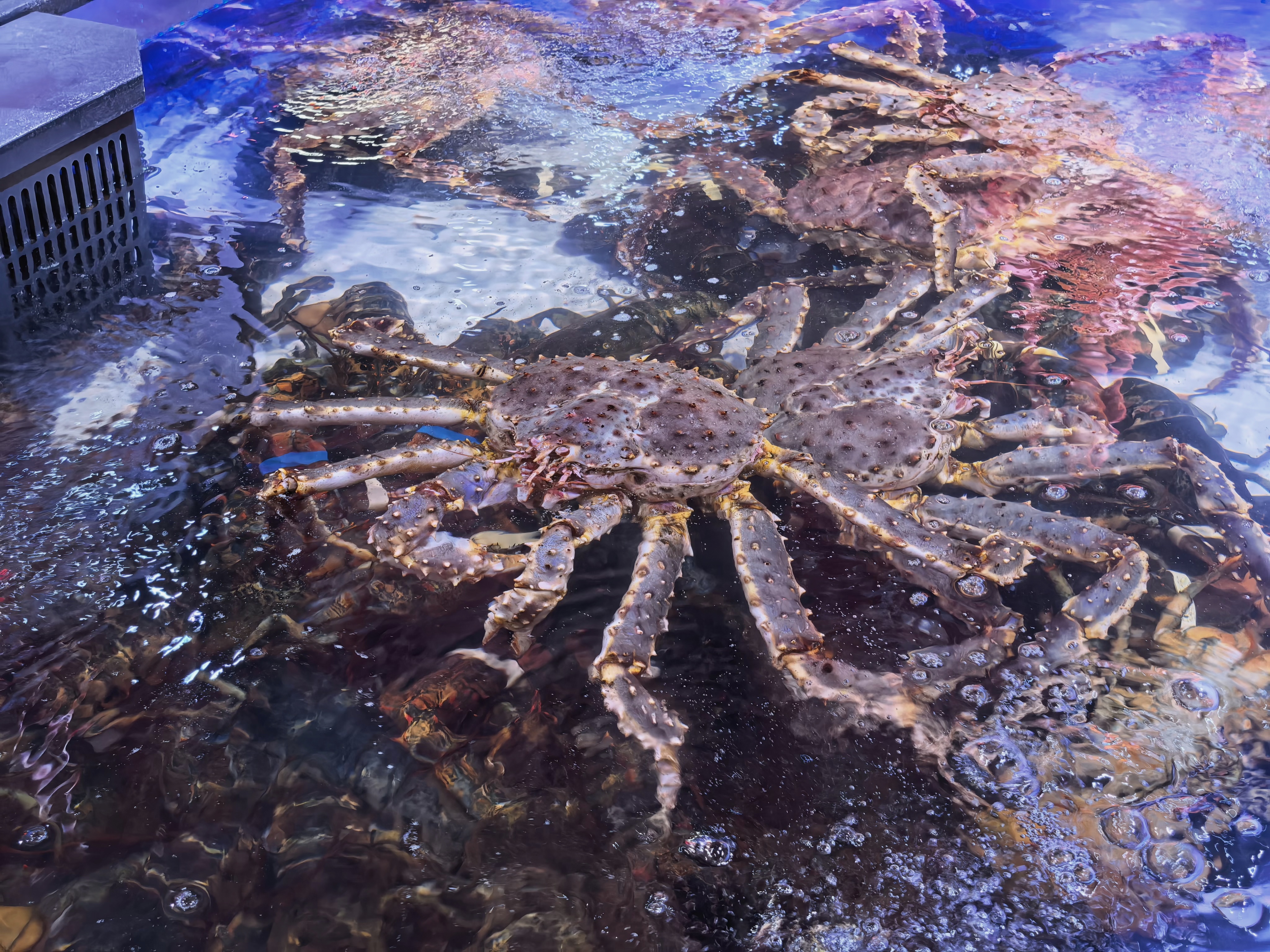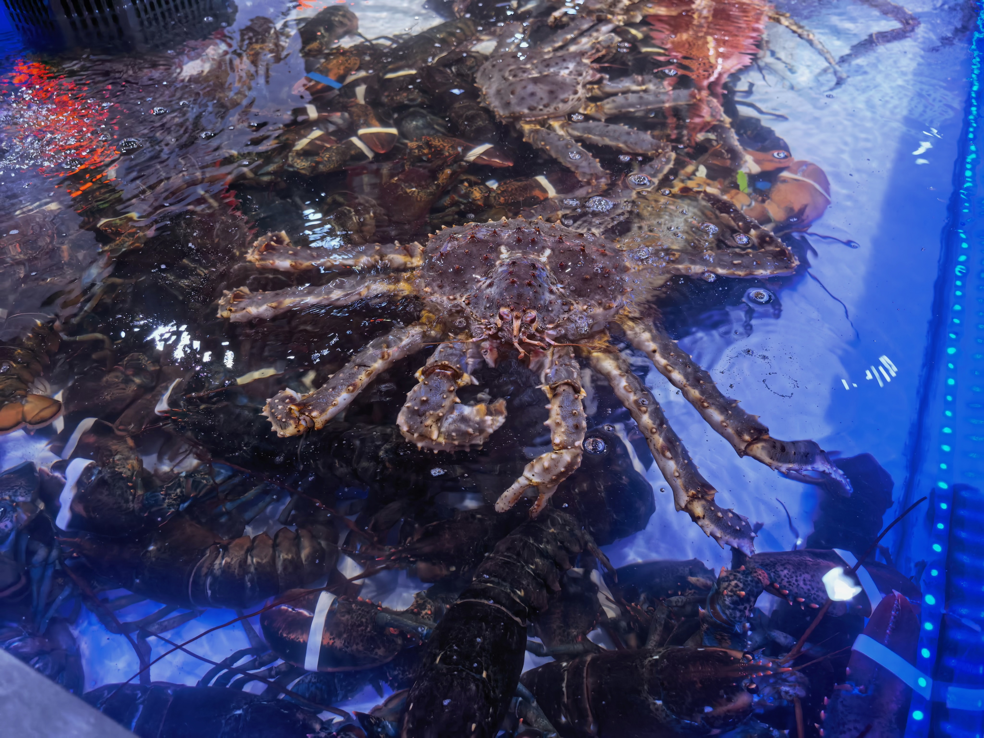 我靠,这个帝王蟹从鱼池的最外侧游到我面前要夹我。你死定了!我保证你今晚一定熟透了