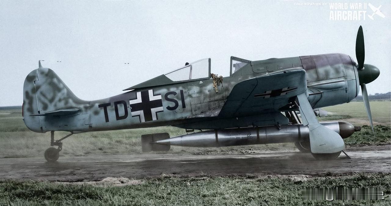 福克-沃尔夫Fw 190 A-5型战斗机,配备实验性鱼雷装置,摄于德国空军为适应海上攻击任务而进行的改装测试期间。 德国战机 历史 历史老照片 二战 德国