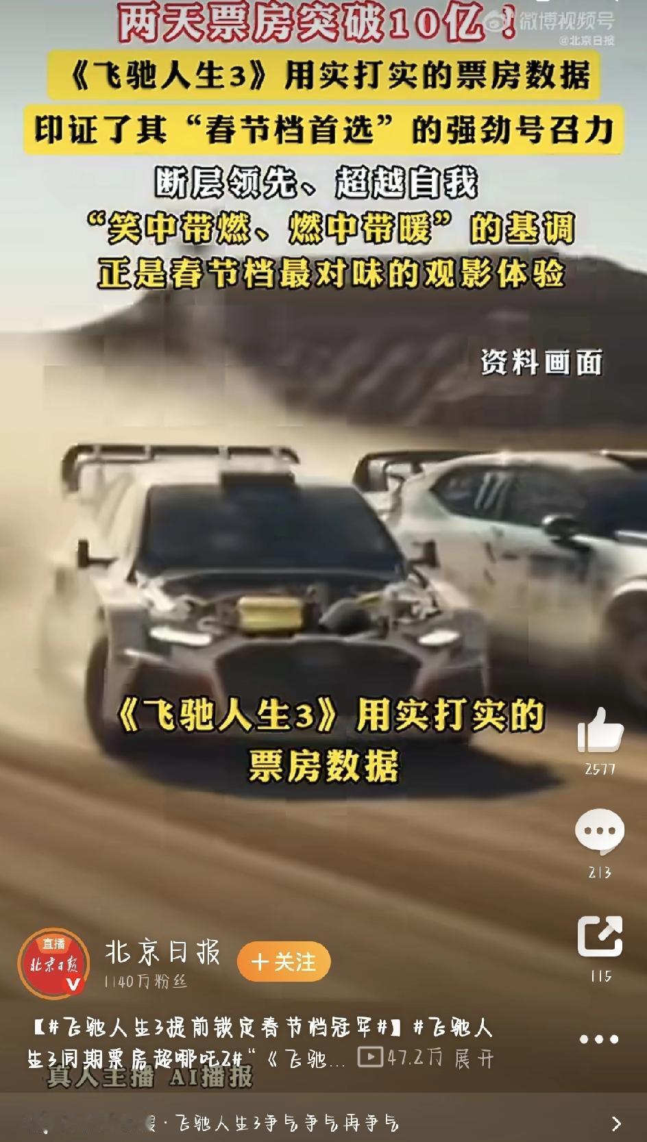 今年春节档的电影市场,基本被《飞驰人生3》给“包圆”了。一上映就冲上热搜,票房一路狂飙,成了大家过年见面必聊的话题——“你看了没?” 往年春节档,一般得争个两三天才能分出谁是冠军,今年压根没悬念。《飞驰人生3》大年初一一登场,就直接锁定了胜局。北京一家影院的经理都直呼:不管是全国大盘还是自家影院,这片子的排片和票房都是第一,妥妥的春节档“顶流”。 数据也很能打。大年初一当天,票房直接冲过6.39亿元,比去年大热的《哪吒之魔童闹海》同期(4.87亿)高出一大截。到了初二,优势更明显,排片占比涨到36.6%,上座率28.2%,把其他片子甩得连尾灯都看不见。截至2月18日,总票房已经破了10.9亿元,比前两部快太多太多。票务平台甚至大胆预测:这片最终有可能冲上50亿。 那问题来了——为啥它能这么火? 中国电影评论学会的胡建礼一句话点透:首先,沈腾带队,全员喜剧人,春节谁不想看点轻松的?气氛到位了,年味儿就来了。其次,后半段一个多小时全是赛车戏,真飙真跑真刺激,热血沸腾,又燃又爽。搞笑和燃向拿捏得刚刚好,男的女的老的少的,都能找到爽点。 但真正戳人的,是电影里那股劲儿。反派车队开着最先进的辅助驾驶,最后还是输给了沈腾和尹正这对“人肉组合”。输的不是技术,是人那股不服输的魂儿。主角从跌到谷底、快爬不起来,到咬牙重新上路,看得人又笑又哭,心都跟着揪起来。 既有笑点又有燃点,还有一个让人愿意相信的故事。《飞驰人生3》能断崖式领跑春节档,确实不冤。 按这势头,它不只是今年春节档的冠军,搞不好还能刷出整个系列的新纪录,成为国产电影又一个大爆款。你看过了没?还没看的话——真可以安排上了,毕竟这一回,赢的不仅是车速,还有人心。 来源:北京日报